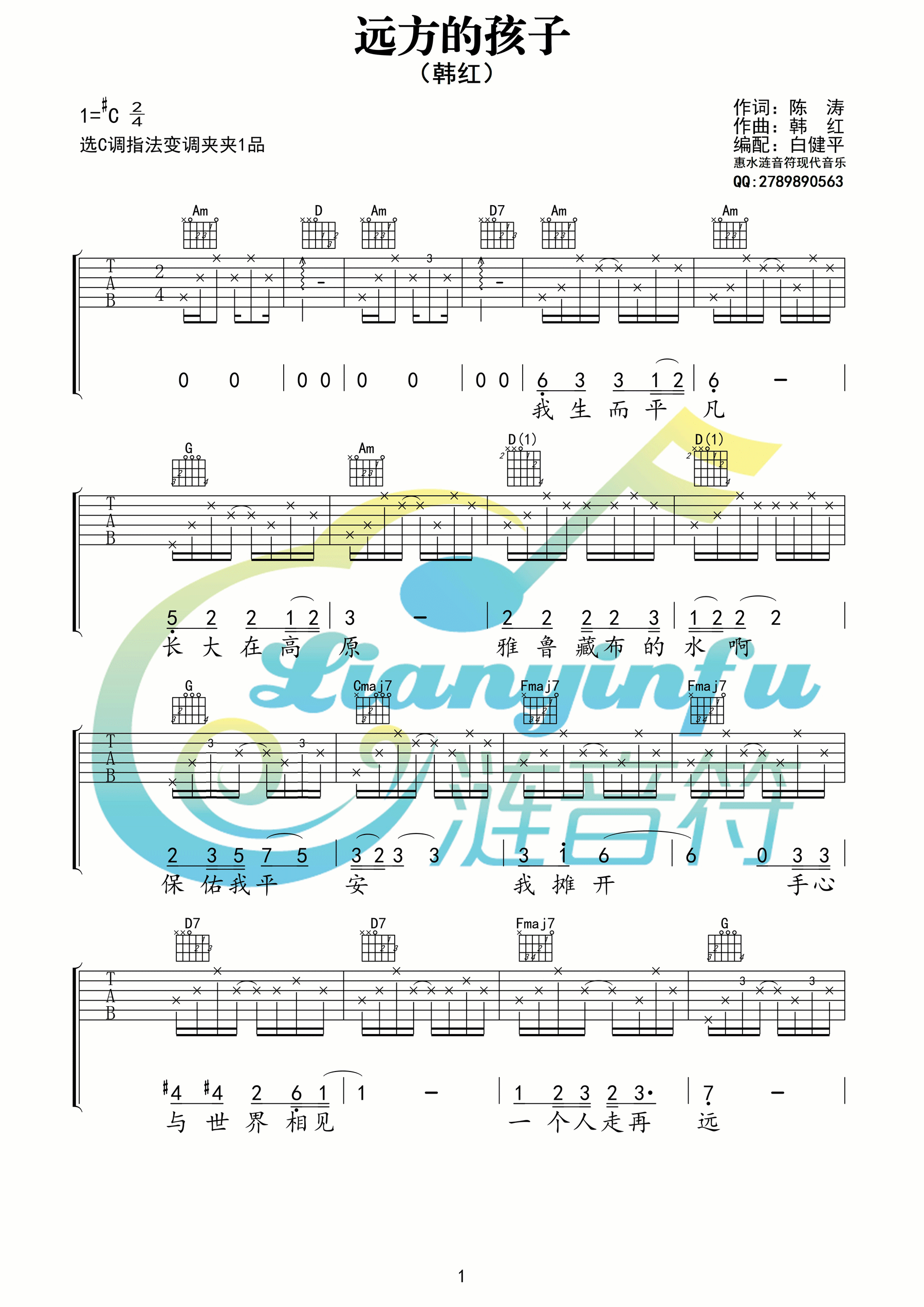 曲谱介绍: 韩红《远方的孩子》吉他弹唱谱,采用C调指法编配,涟音符编配出品,共有4张高清图谱。