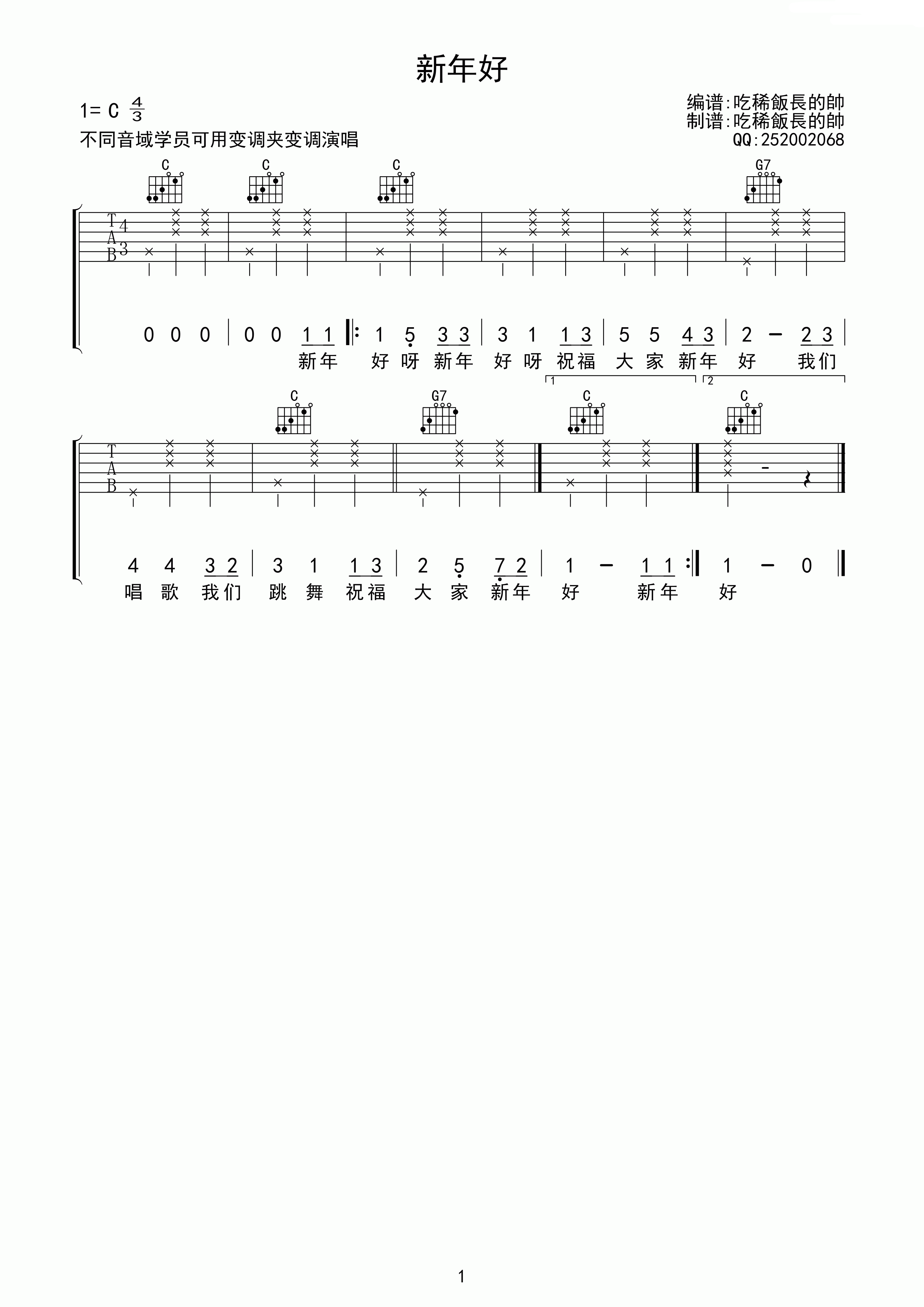 曲谱介绍: 儿歌《新年好》吉他弹唱谱,采用C调指法编配,吃稀饭长得帅编配出品,共有1张高清图谱,免翻页排版设计。