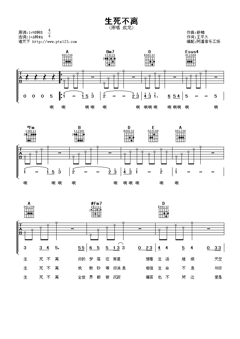 曲谱介绍: 成龙《生死不离》吉他弹唱谱,采用A调指法编配,阿潘音乐工场编配出品,共有4张高清图谱。
