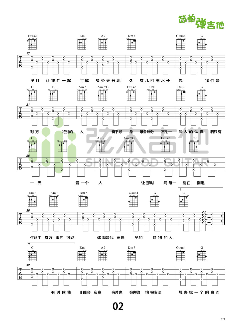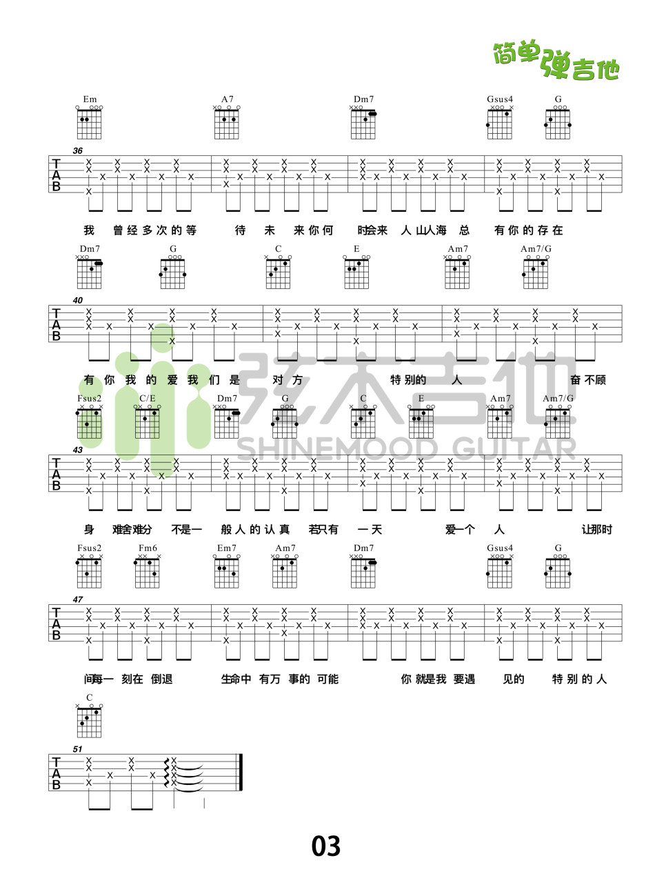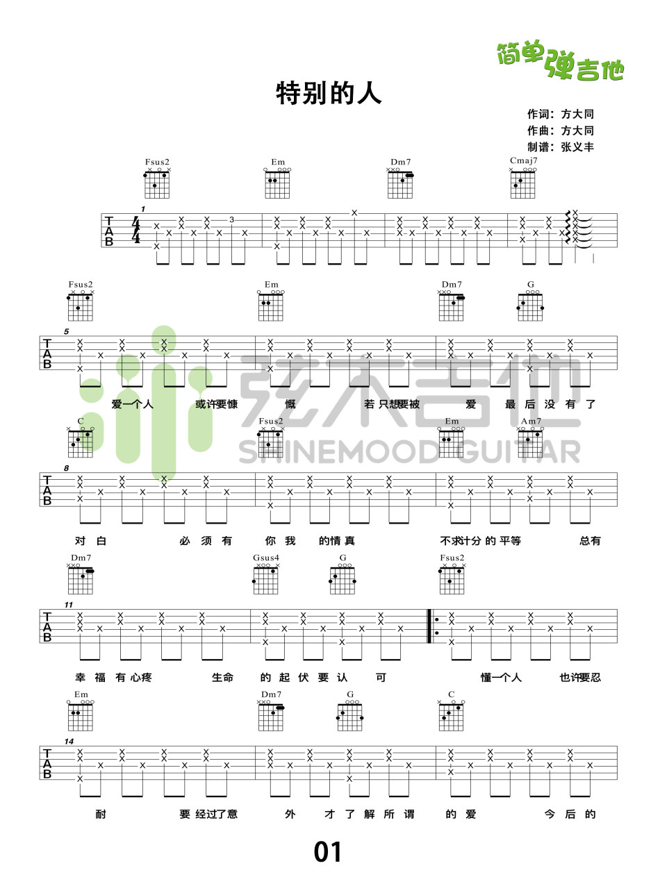 曲谱介绍: 方大同《特别的人》吉他弹唱谱,采用C调指法编配,弦木吉他编配出品,共有3张高清图谱。