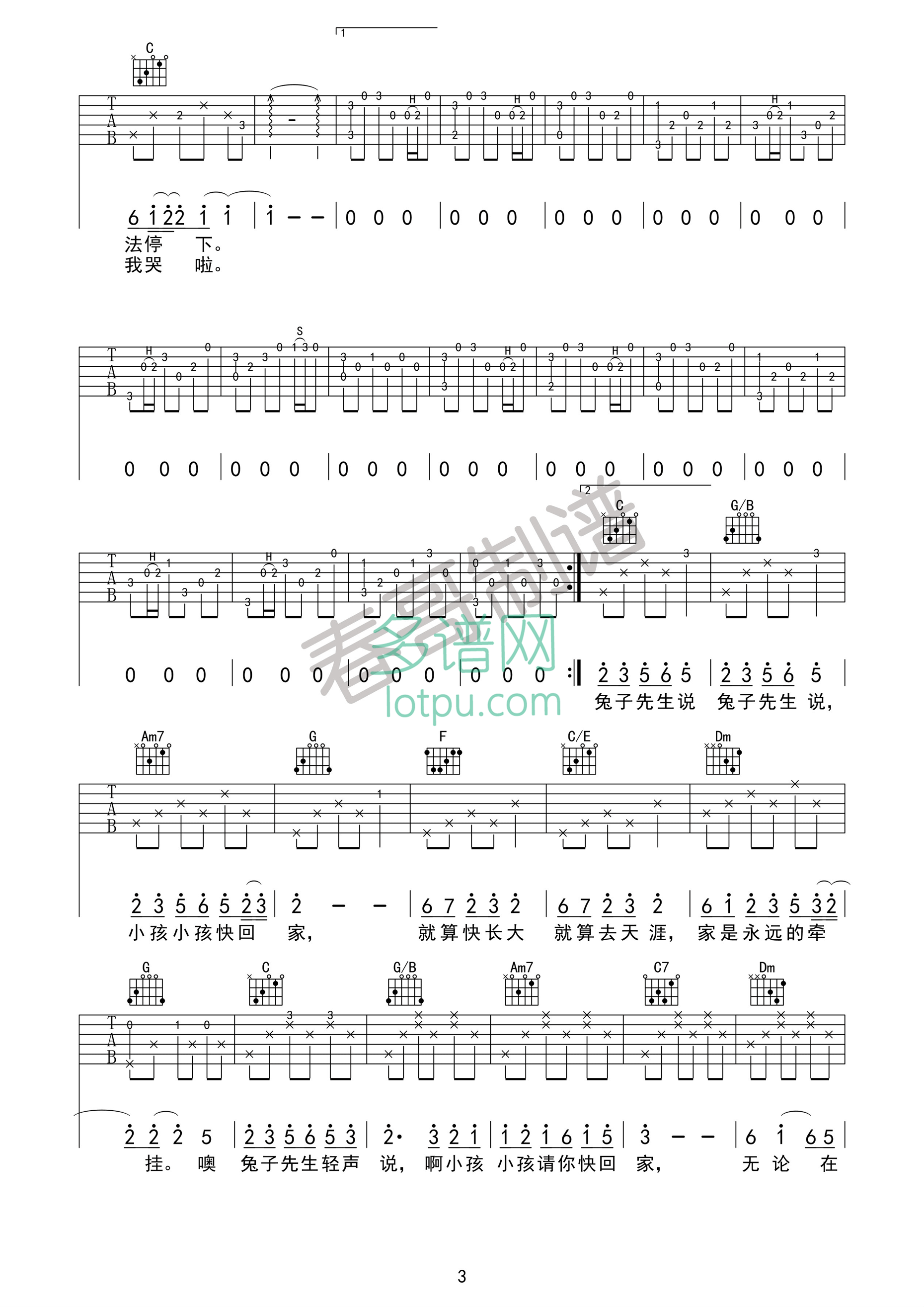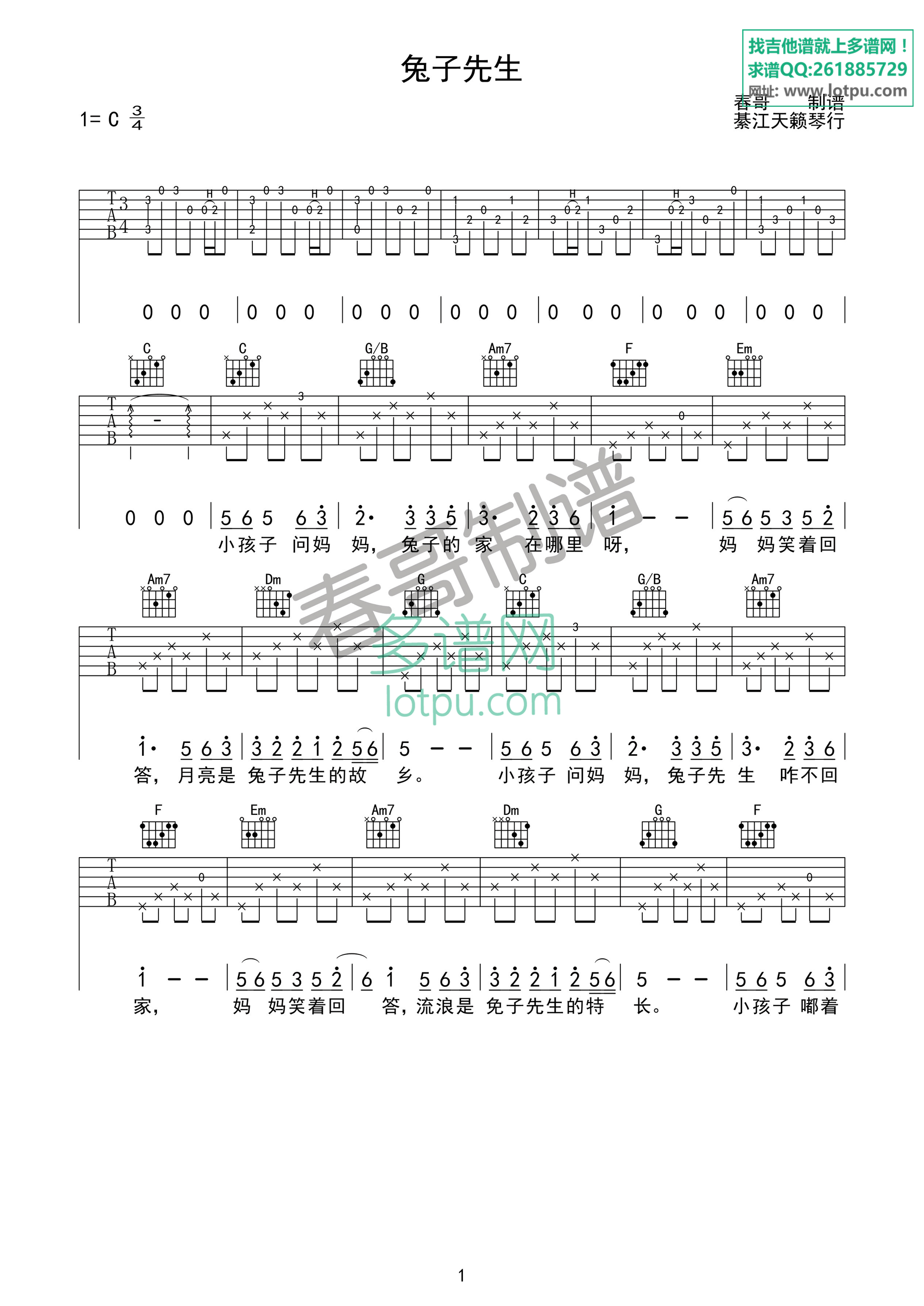 曲谱介绍: 洛天依《兔子先生》吉他弹唱谱,采用C调指法编配,春哥制谱编配出品,共有3张高清图谱。