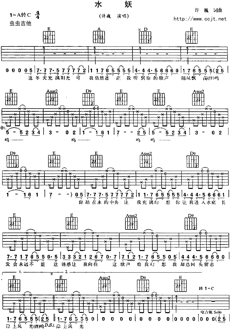 曲谱介绍: 许巍《水妖》吉他弹唱谱,采用C调指法编配,共有2张高清图谱,免翻页排版设计。