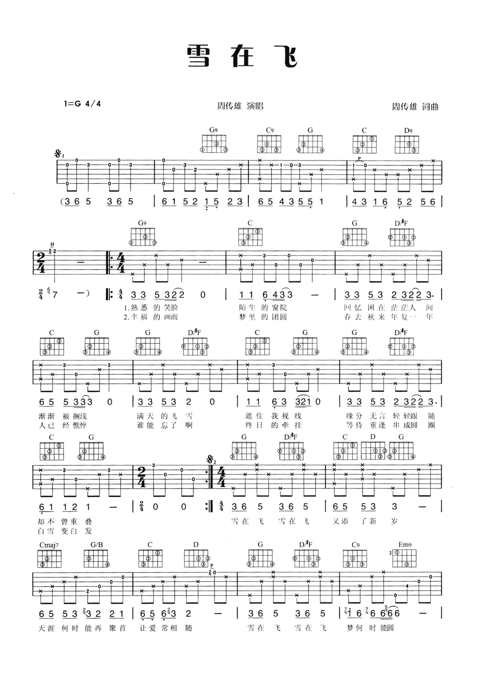 曲谱介绍: 周传雄《雪在飞》吉他弹唱谱,采用G调指法编配,共有2张高清图谱,免翻页排版设计。
