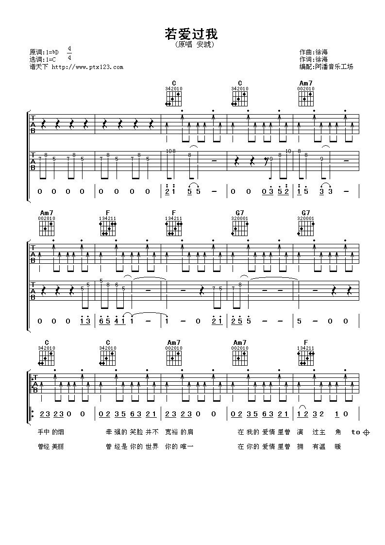 曲谱介绍: 安琥《若爱过我》吉他弹唱谱,采用C调指法编配,阿潘音乐工场编配出品,共有4张高清图谱。