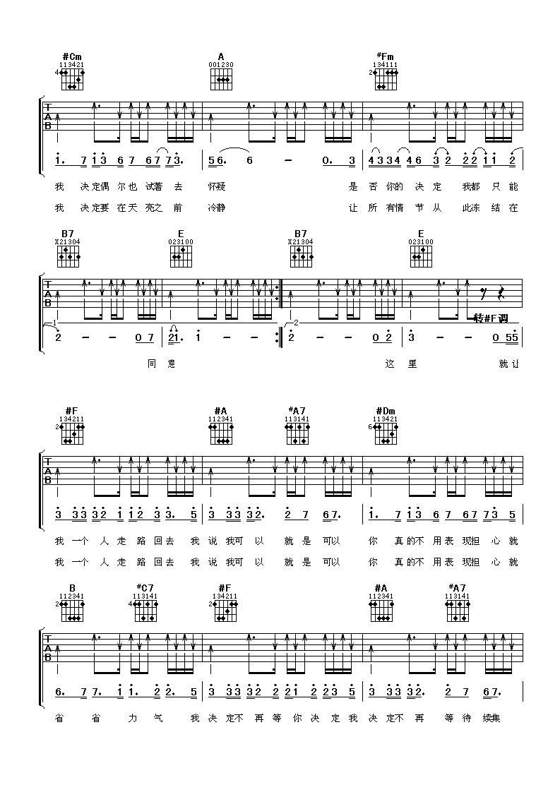 曲谱介绍: 梁静茹《我决定》吉他弹唱谱,采用F调指法编配,阿潘音乐工场编配出品,共有4张高清图谱。