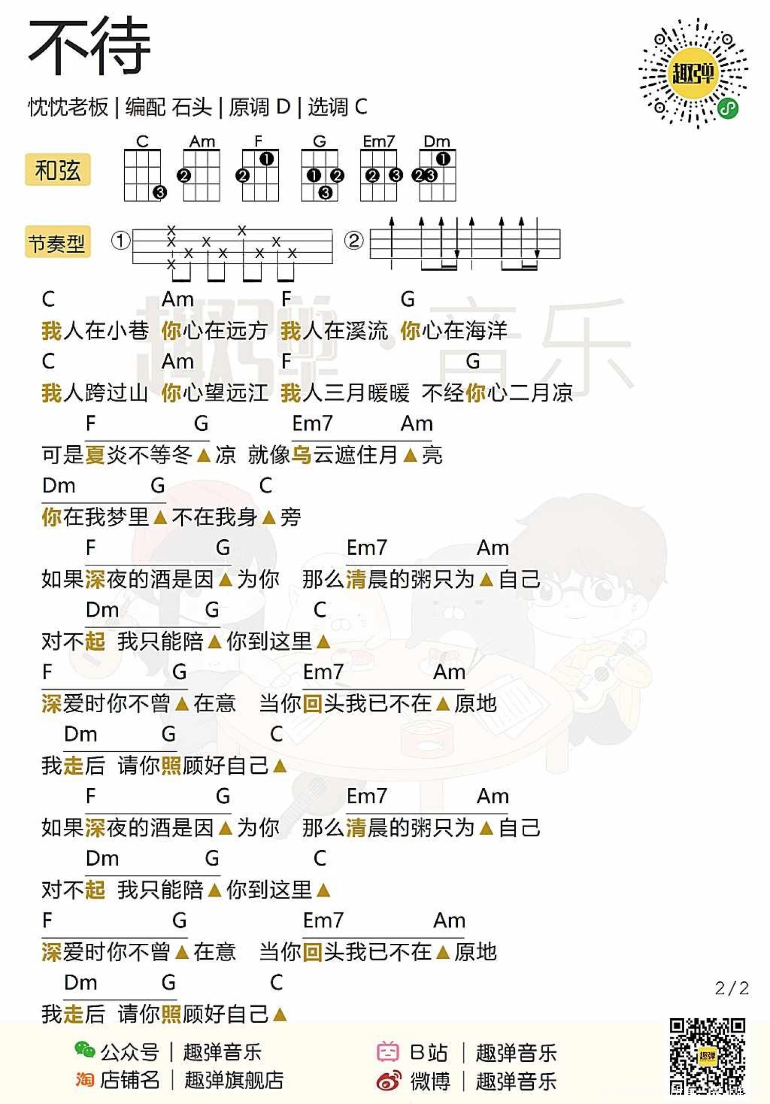 曲谱介绍: 忱忱老板《不待》尤克里里谱,共有1张高清图谱,免翻页排版设计。