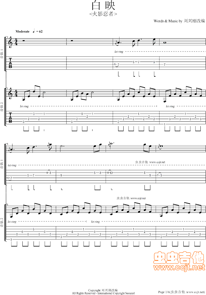 曲谱介绍: 高梨康治《白映》吉他独奏谱,虫虫吉他编配出品,共有5张高清图谱。