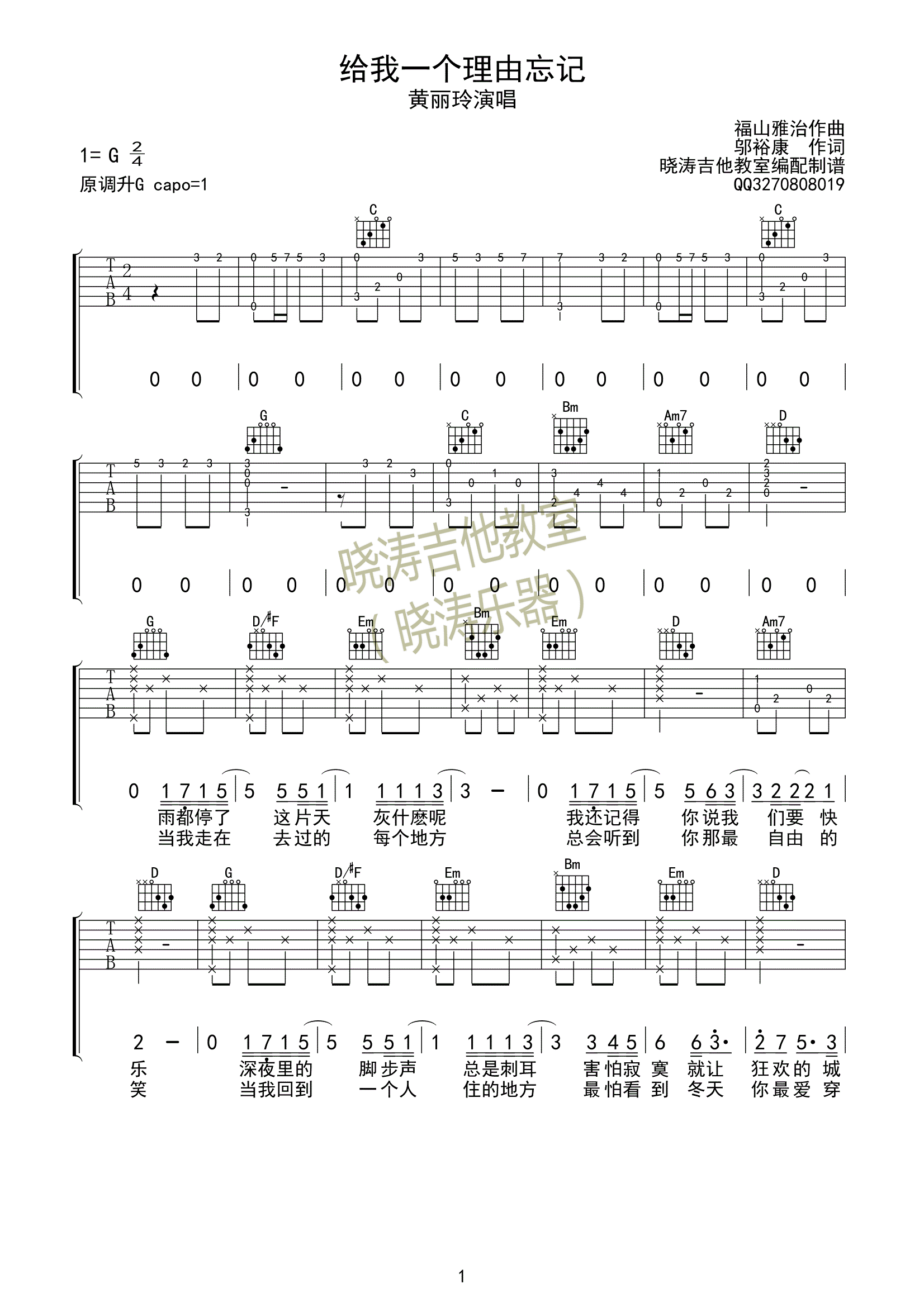 曲谱介绍: 给我一个理由忘记《给我一个理由忘记G调精选版_晓涛》吉他弹唱谱,采用G调指法编配,晓涛吉他教室编配出品,共有3张高清图谱。