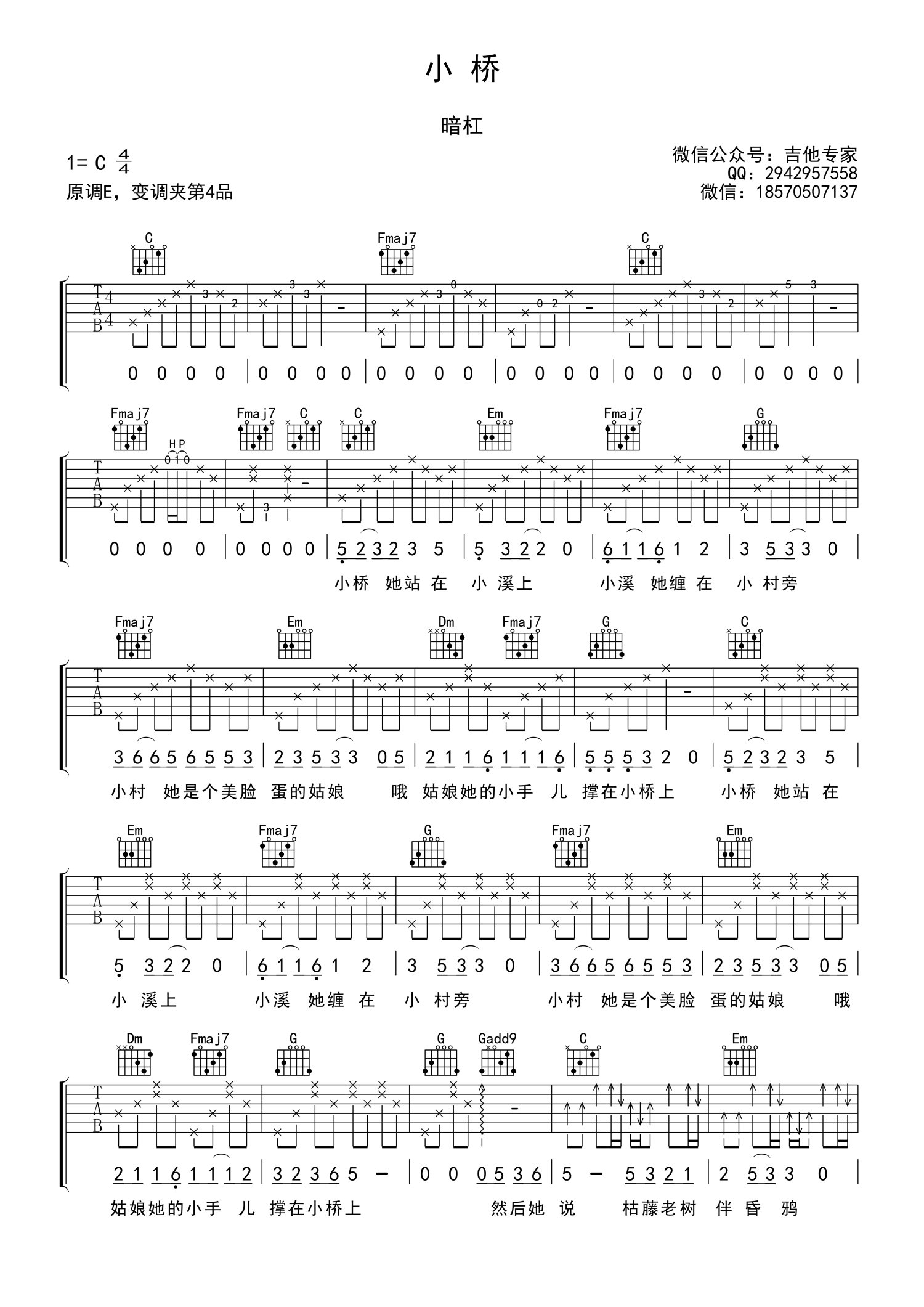 曲谱介绍: 暗杠《小桥》吉他谱,原调E,变调夹夹四品,C调指法编配。延续《阿婆说》的经典,暗杠这首《小桥》带你梦回老家。真的是一首可以听着睡着的歌,柔软的词藻,朴实中不失优雅,小桥这样的一种静物,被拟人以一个温闻委婉的姑娘,不仅阔于山野,也可以藏匿于爱情,静心弹唱这首歌,用心感受,什么是美,什么是爱,什么是自然。