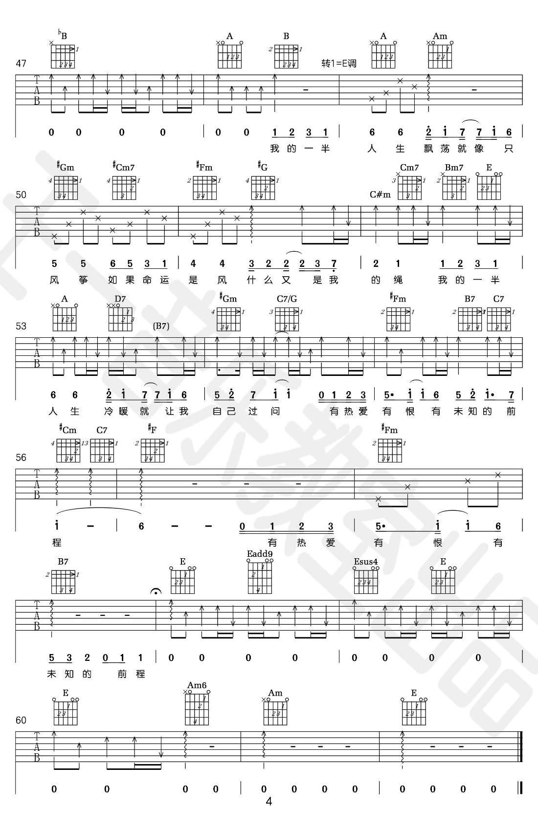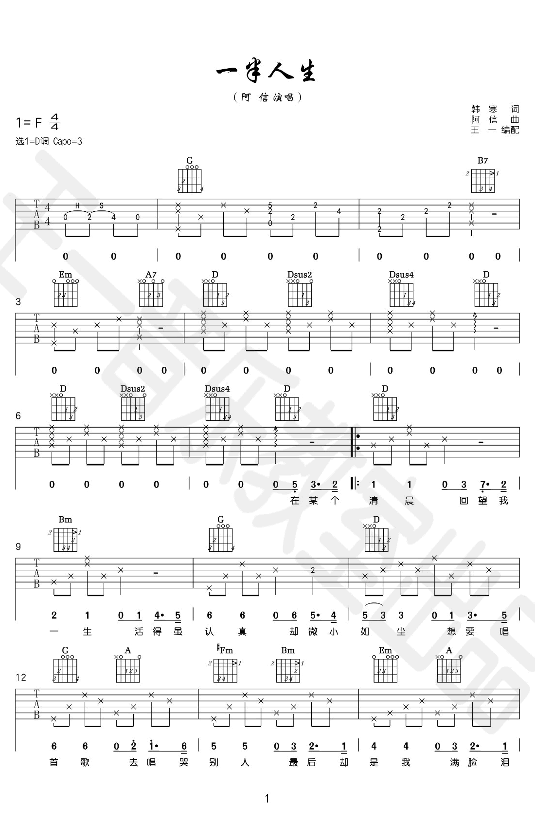 曲谱介绍: 五月天《一半人生》吉他弹唱谱,采用F调指法编配,王一音乐教室编配出品,共有4张高清图谱。