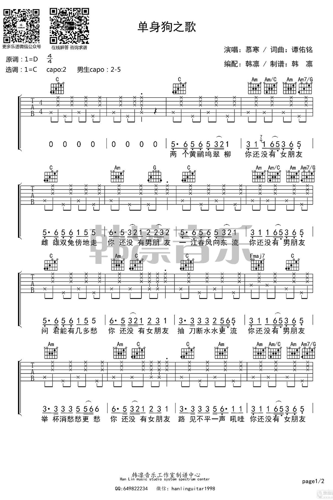 曲谱介绍: 慕寒《单身狗之歌》吉他弹唱谱,采用C调指法编配,韩凛音乐编配出品,共有2张高清图谱,免翻页排版设计。