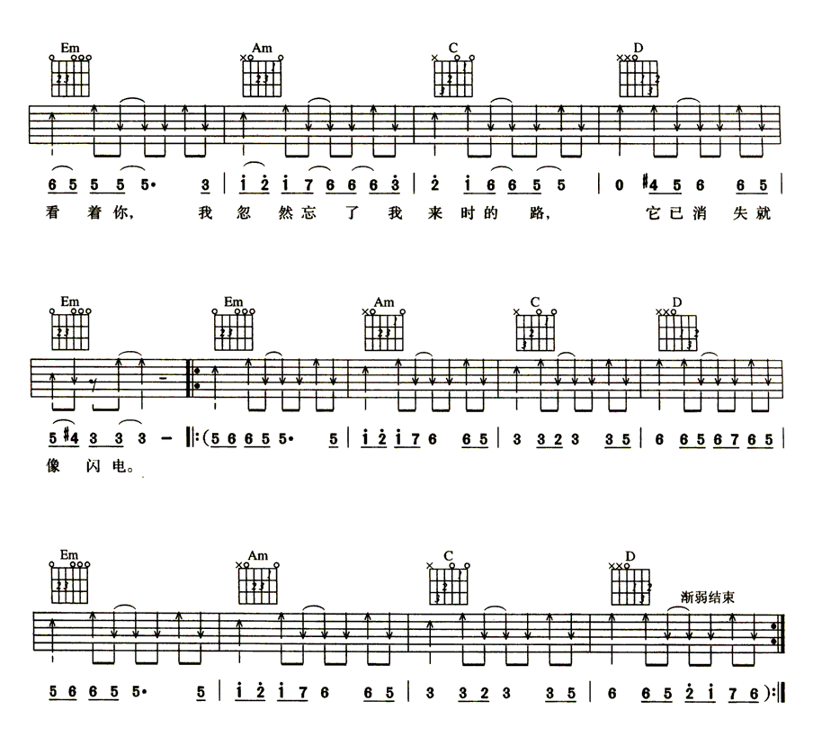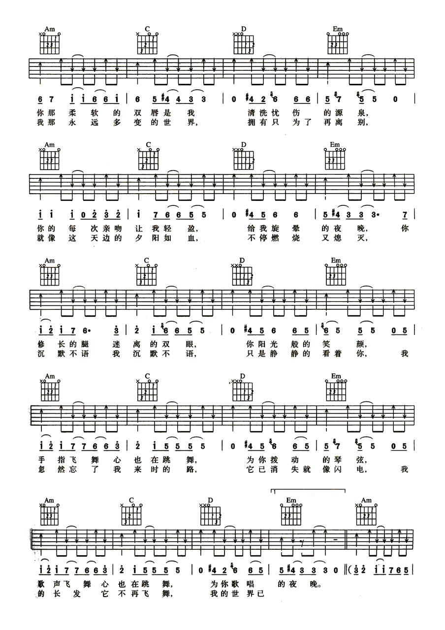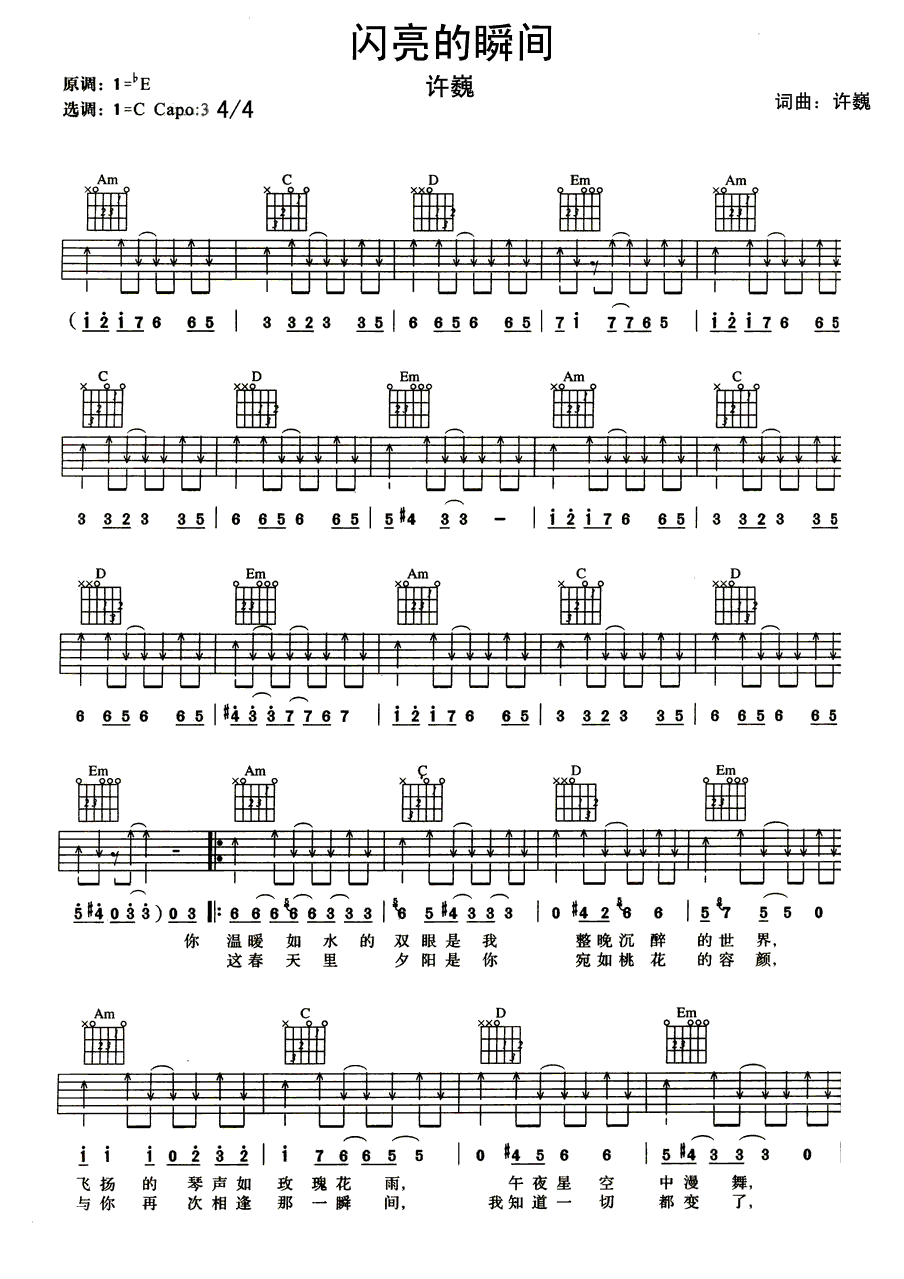 曲谱介绍: 许巍《闪亮的瞬间》吉他弹唱谱,采用C调指法编配,共有4张高清图谱。