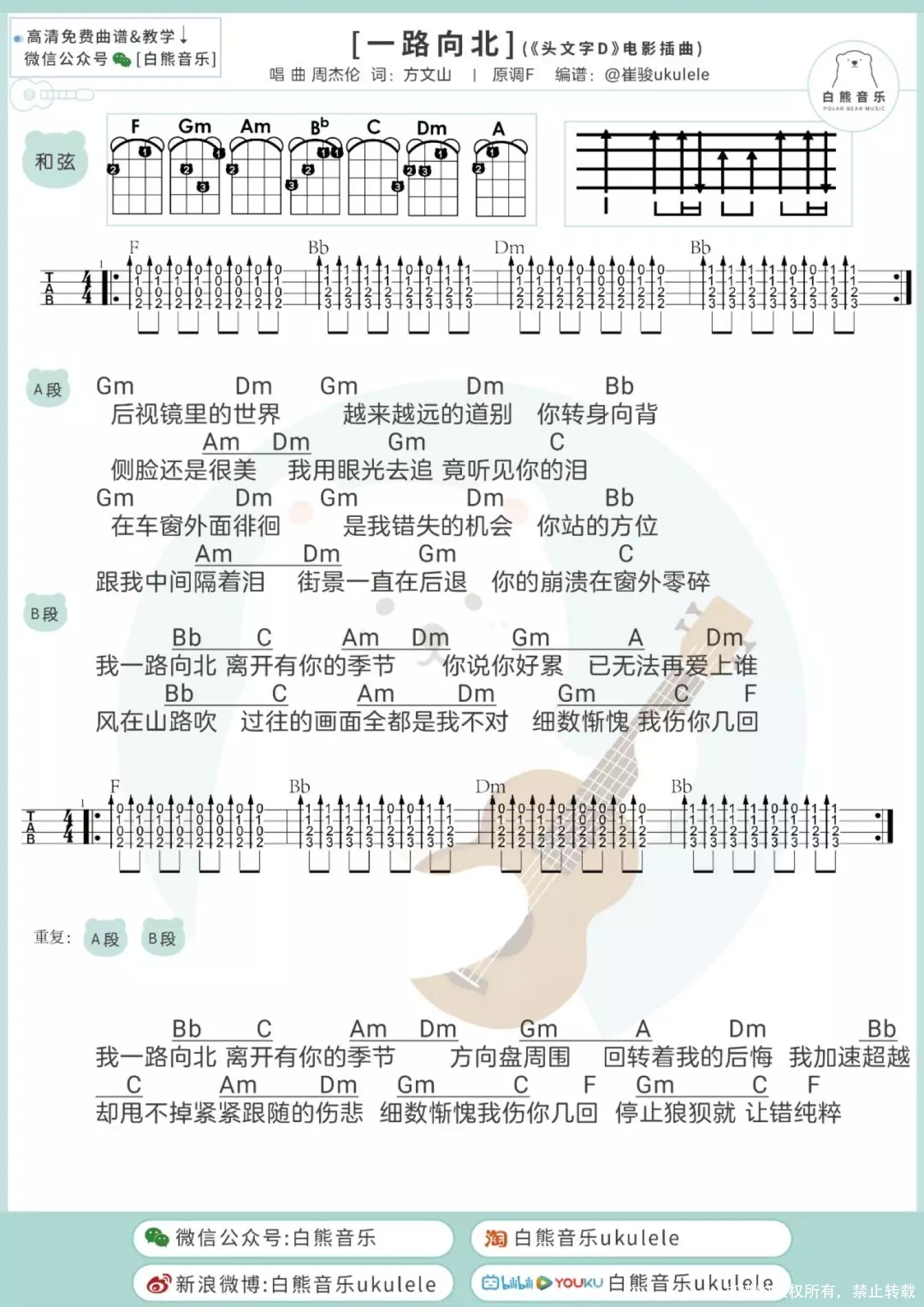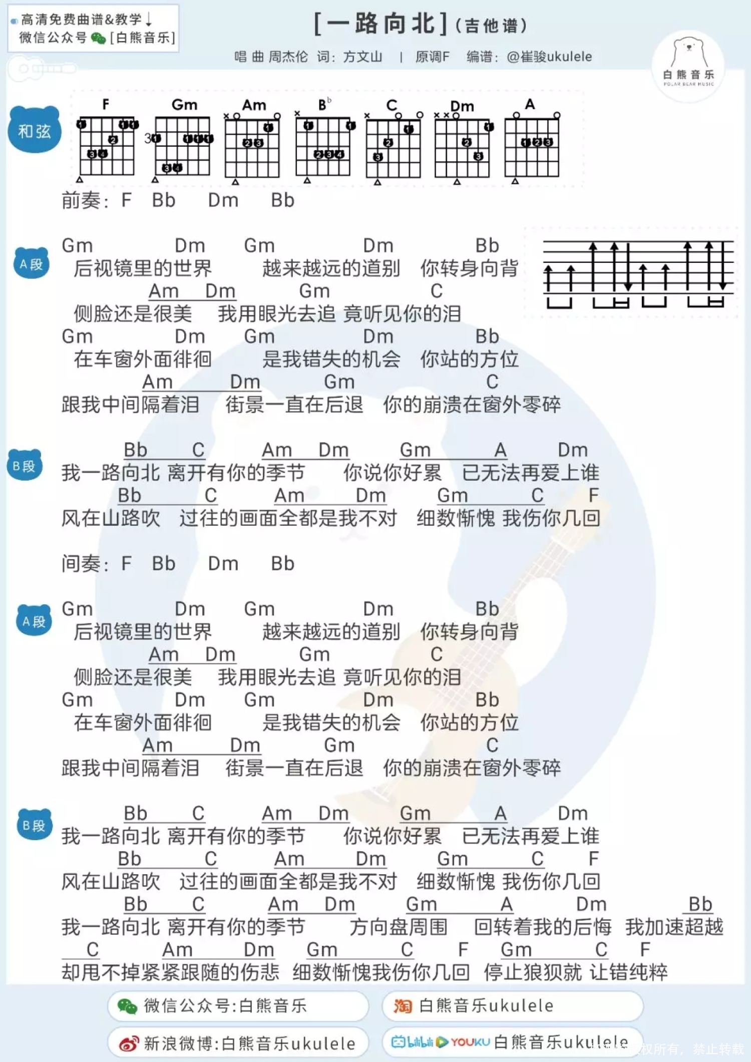 曲谱介绍: 桃子鱼仔版 一路向北尤克里里 白熊版 一路向北ukulele 目录 桃子鱼仔版 一路向北尤克里里 周杰伦的这首歌里,隐藏着太多太多的遗憾了 失恋的时候 开着车,眼泪向后甩去 就看不到自己在哭!   ukulele 弹 唱 教 学   「一路向北」尤克里里谱   白熊版 一路向北ukulele 一路向北Ukulele弹唱教学   一路向北ukulele谱   一路向北吉他谱