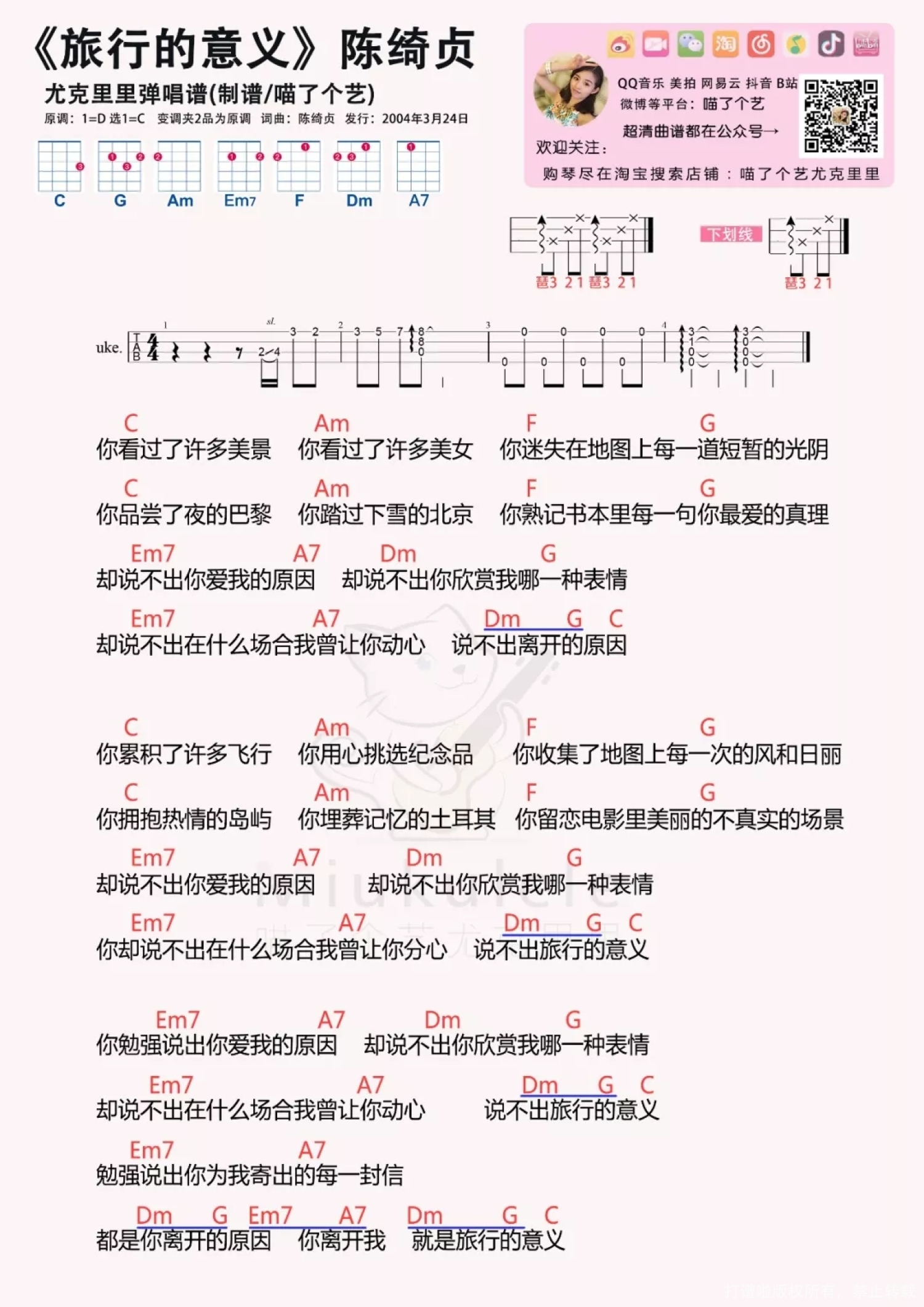 曲谱介绍: 文艺小曲🎵|陈绮贞《旅行的意义》尤克里里弹唱教程 “你离开我,就是旅行的意义……” 陈老师的歌又大又小,又永久。 这个教程同样对初学者挺友好的,喜欢这首歌的朋友不妨试试! 前奏教学放在教程最末。   弹唱教学