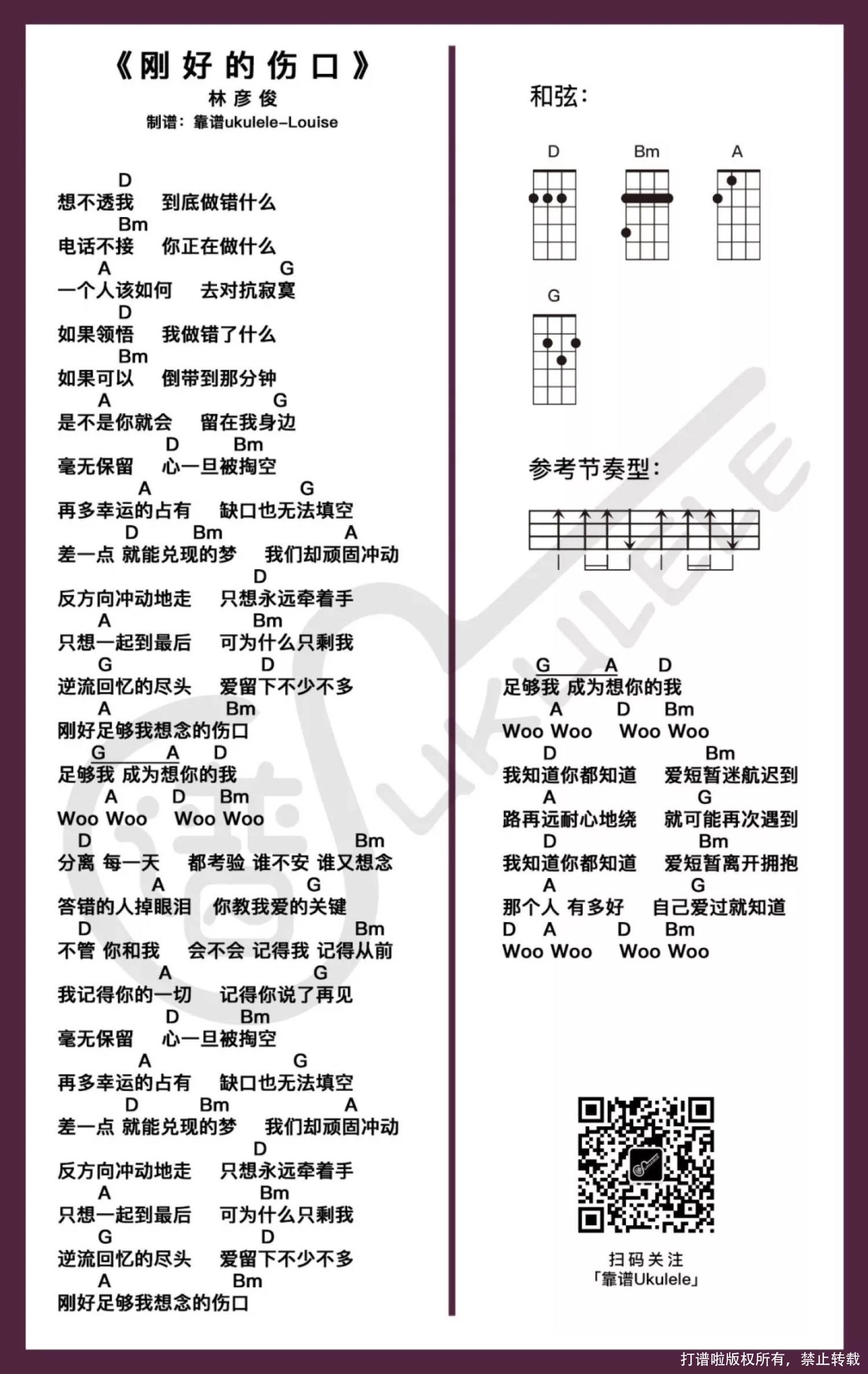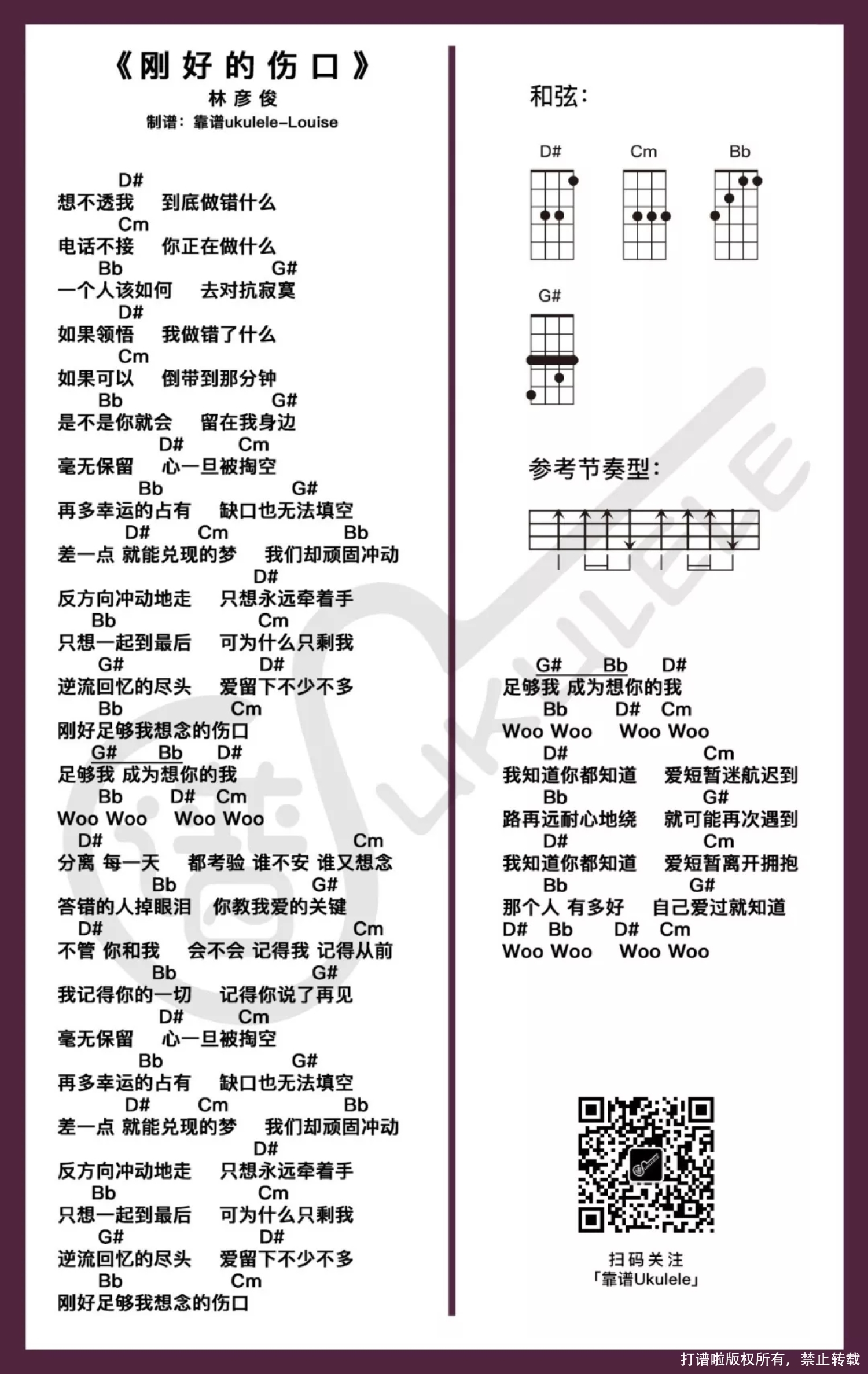 曲谱介绍: 是来自一位「林夫人」的求谱哈哈哈哈哈,看到谱不知道有没有开心? 搜不到音频~ヽ(ー_ー)ノ,想听的宝宝有wifi的可以看视频(流量大亨也可以直接点),或者到音乐平台付费收听哟~ 林彦俊《刚好的伤口》MV官方版   难度系数:★★ 用到的和弦都是不常见的,不招人喜欢的有Bb和G#,G#大横按跟D#切换的时候稍微有些不方便,除了说多练习之外,真的不知道有什么捷径可以走。 一切仅供参考啦~如果想挑战调整适合自己的和弦谱的话,可以参考之前分享的→『简单转调』←自己试着调整一下~。   「刚好的伤口」尤克里里谱   没有仔细看到可能会错过这个版本哟~嘿嘿嘿 难度系数:★ 常见和弦组,其实就是将和弦降调了,和弦是好按超多,但是跟原调就有差别了,所以想接近原调的选上面的版本练习。对歌熟悉且跟我一样觉得原调还是有点高的可以参考这个版本。 当然这个版本你也可以尝试变调夹夹一品试试看(✪ω✪)。   简单版
