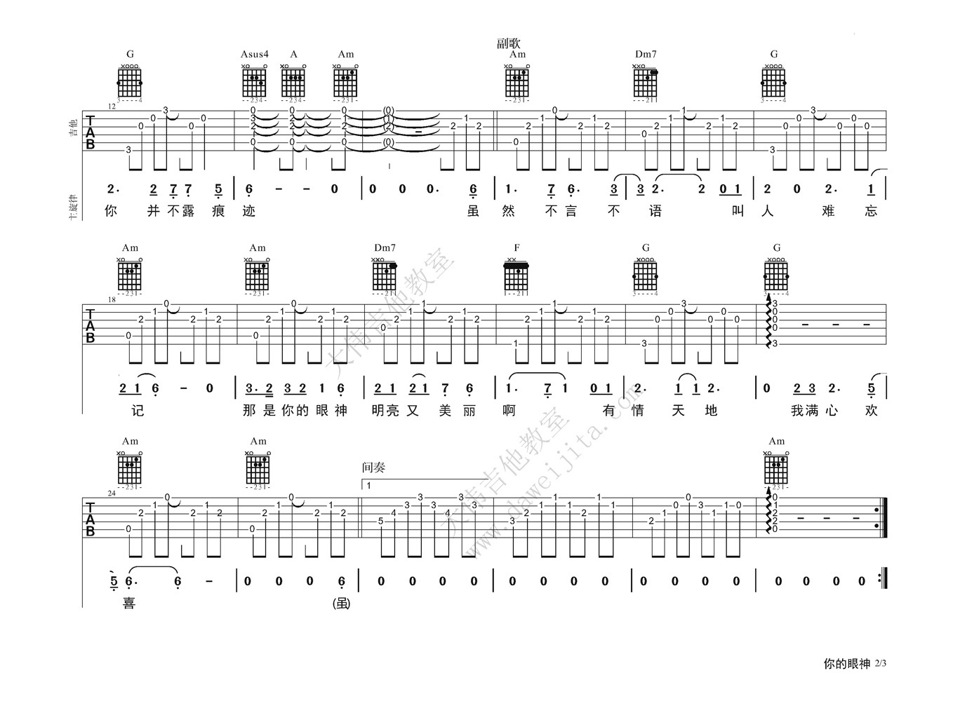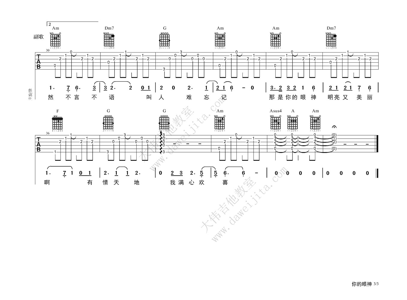 曲谱介绍: 蔡琴《你的眼神》吉他弹唱谱,采用C调指法编配,大伟吉他教室编配出品,共有3张高清图谱。