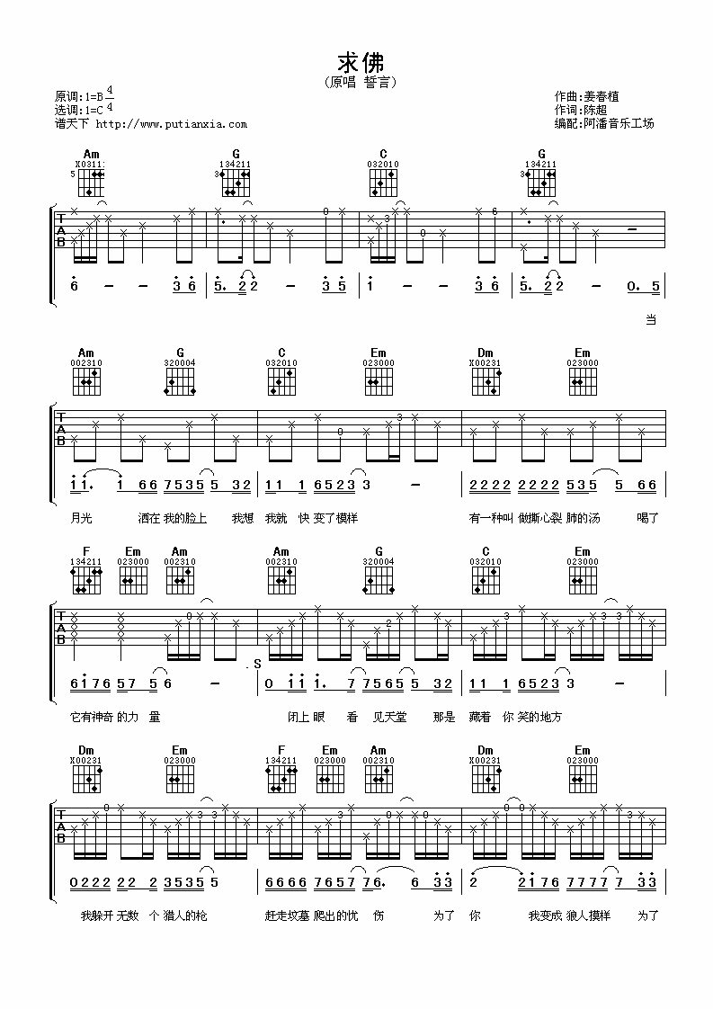 曲谱介绍: 誓言《求佛》吉他弹唱谱,采用C调指法编配,阿潘音乐工厂编配出品,共有3张高清图谱。