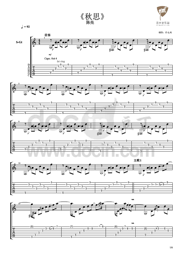 曲谱介绍: 陈亮《秋思》吉他独奏谱,豆丁编配出品,共有6张高清图谱。
