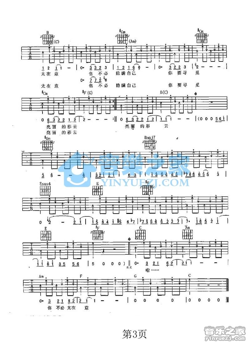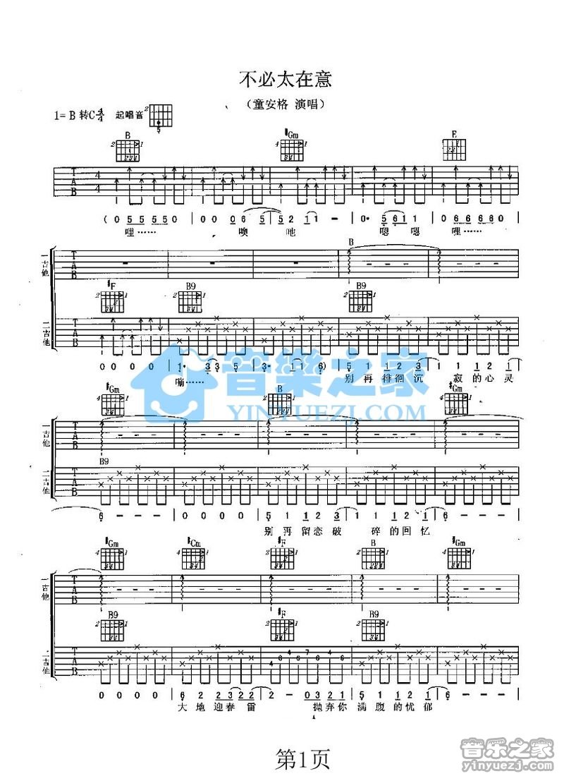 曲谱介绍: 童安格《不必太在意》吉他弹唱谱,采用C调指法编配,音乐之家编配出品,共有3张高清图谱。