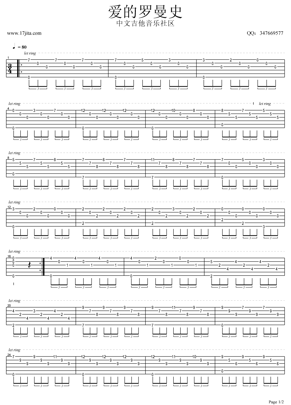 曲谱介绍: 叶佩斯《爱的罗曼史》吉他独奏谱,17吉他编配出品,共有2张高清图谱,免翻页排版设计。