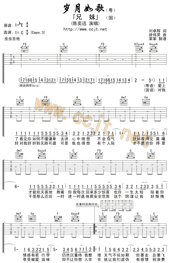 曲谱介绍: 陈奕迅《岁月如歌》吉他弹唱谱,采用C调指法编配,虫虫吉他编配出品,共有3张高清图谱。