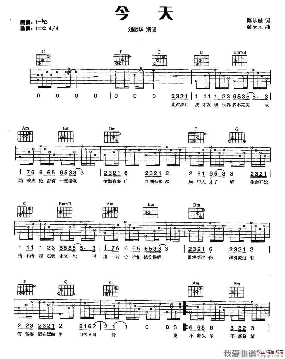 曲谱介绍: 刘德华《今天》吉他弹唱谱,采用C调指法编配,我爱曲谱编配出品,共有2张高清图谱,免翻页排版设计。