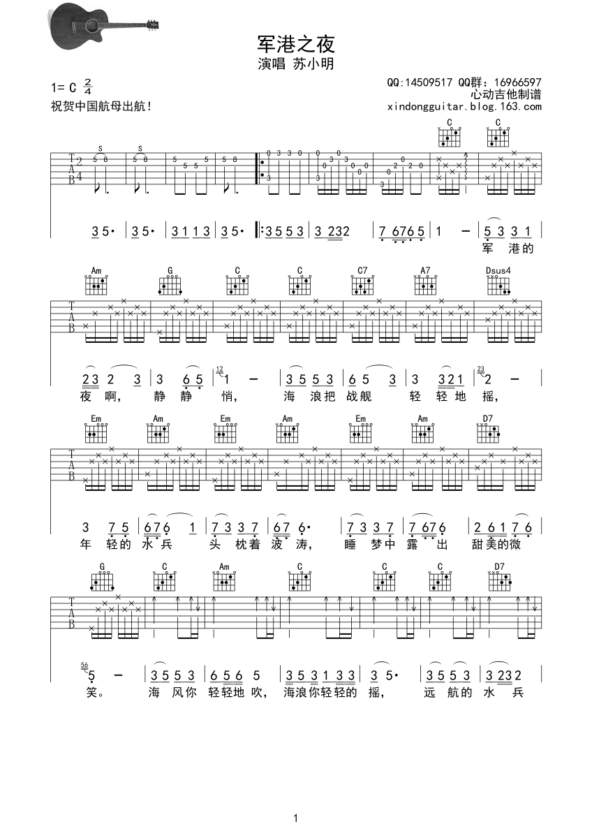 曲谱介绍: 苏小明《军港之夜》吉他弹唱谱,采用C调指法编配,心动吉他编配出品,共有2张高清图谱,免翻页排版设计。