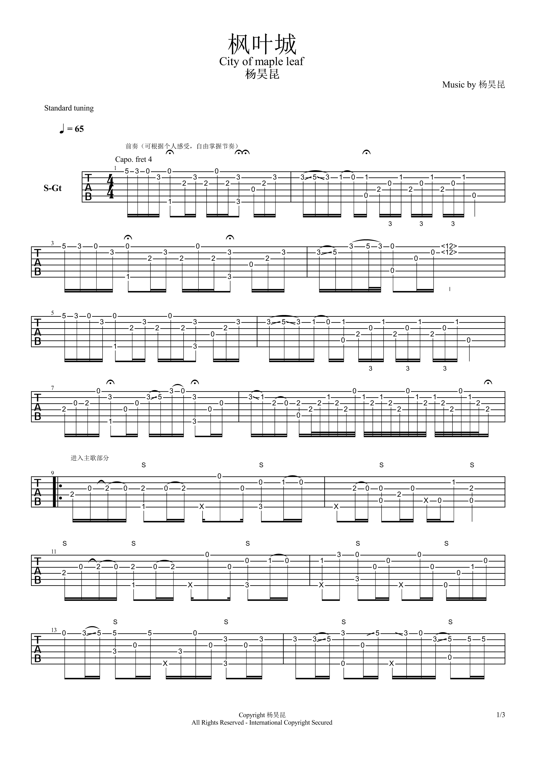 曲谱介绍: 杨昊昆《枫叶城》吉他独奏谱,共有3张高清图谱。