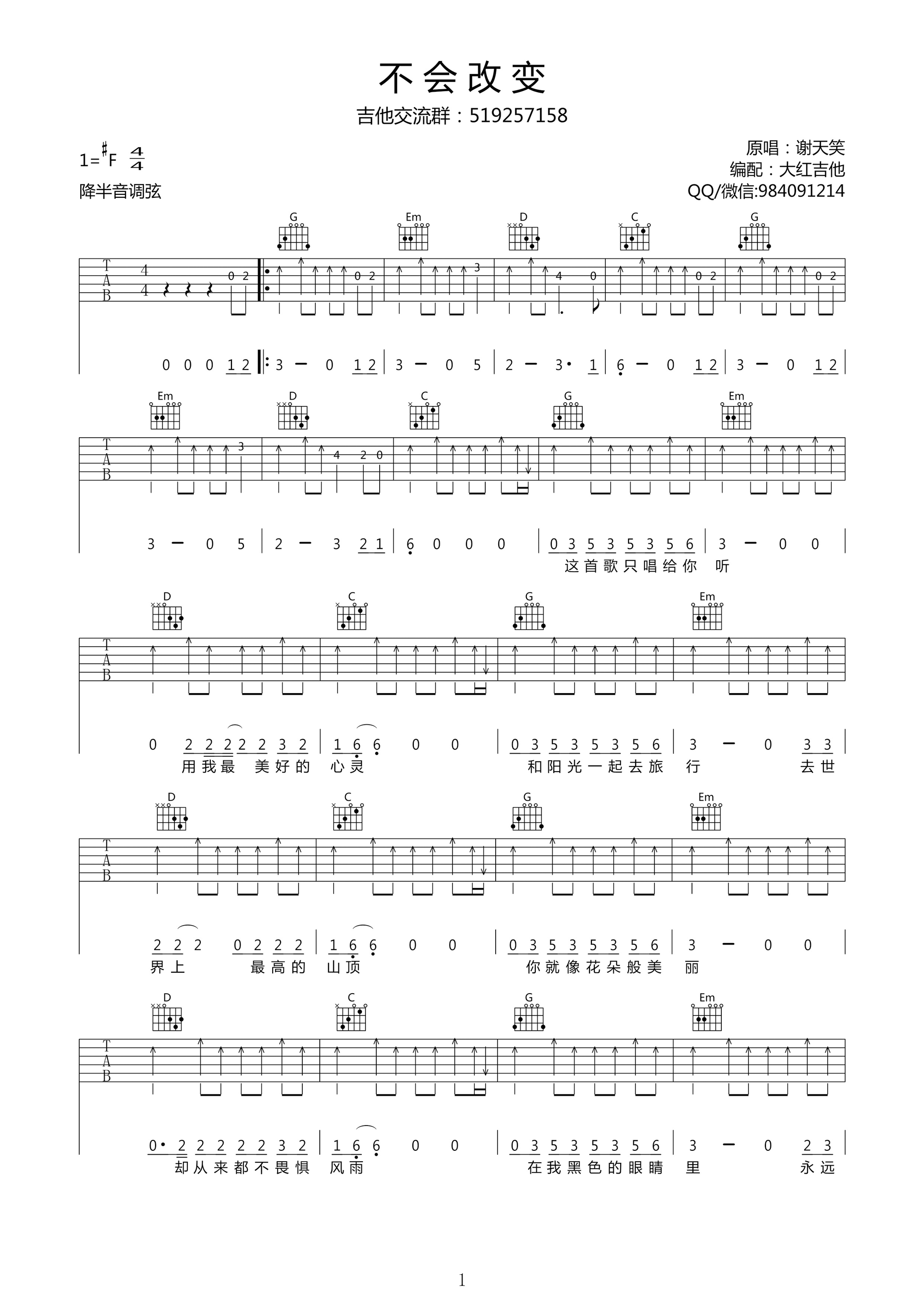 曲谱介绍: 谢天笑《不会改变》吉他弹唱谱,采用F调指法编配,大红吉他编配出品,共有2张高清图谱,免翻页排版设计。