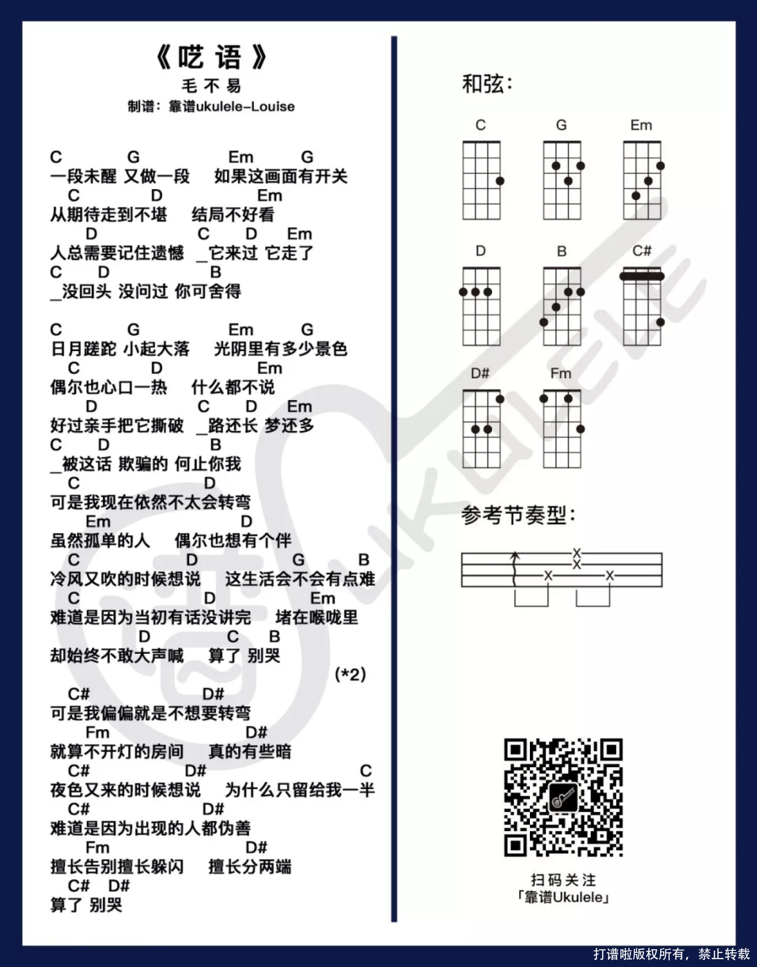 曲谱介绍: 最近分享的都是老歌偏多一点,今天来一首比较新的吧。 这首是来自毛毛(毛不易)在《我是唱作人》中所演唱的最后一首歌《呓语》……歌名中这个“呓”,在生活中是比较少见的一个字,特别查了这个字的意思——梦中说话,呓语也就是梦话了。虽然第四期节目中唱完这首歌的毛毛遭到了淘汰……让不少人觉得很可惜……比赛嘛……就是有很多说不清的……,有人喜欢就有人不爱的,对吧?~ 难度系数:★☆ 除了最后一段的部分升调有出现大横按C#让人不是很喜欢之外,其他的和弦应该都是可以接受的范围? 请注意B和弦出现的次数虽然不多,但是指法看上去与Bb一样,但是对应的品格有差的,不要按错位置哦。   「呓语」尤克里里弹唱谱