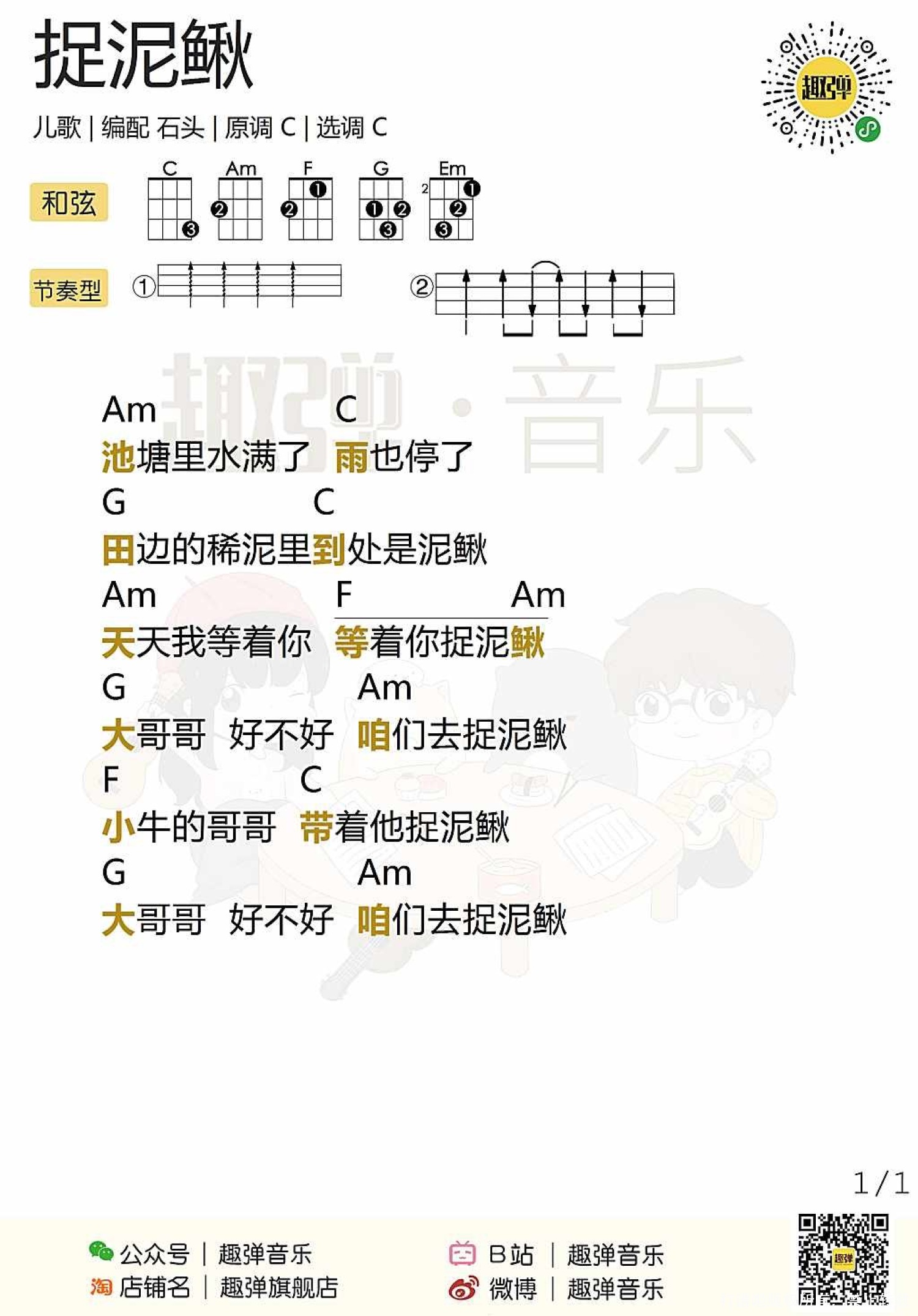 曲谱介绍: 儿歌《捉泥鳅》尤克里里谱,共有1张高清图谱,免翻页排版设计。