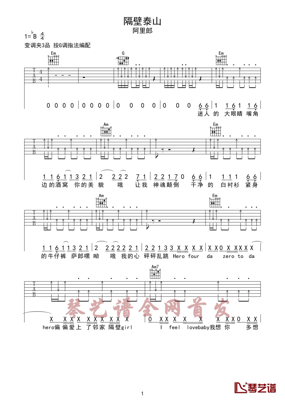 曲谱介绍: 阿里郎《隔壁泰山》吉他弹唱谱,采用B调指法编配,琴艺谱编配出品,共有5张高清图谱。
