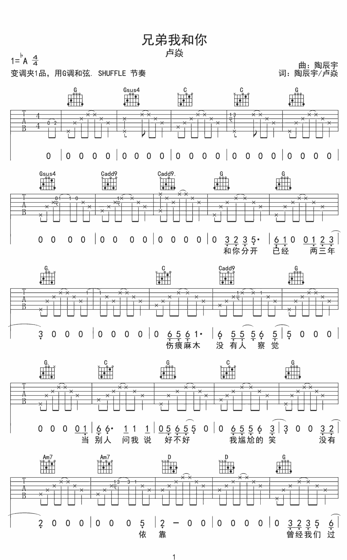 曲谱介绍: 卢焱《兄弟我和你》吉他弹唱谱,采用A调指法编配,共有6张高清图谱。