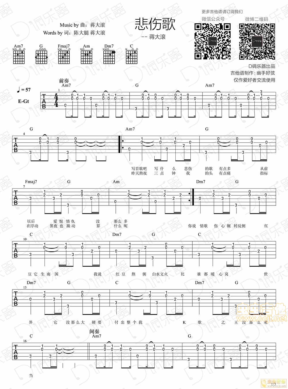 曲谱介绍: 蒋大滚《悲伤歌》吉他弹唱谱,采用C调指法编配,D调乐器编配出品,共有3张高清图谱。