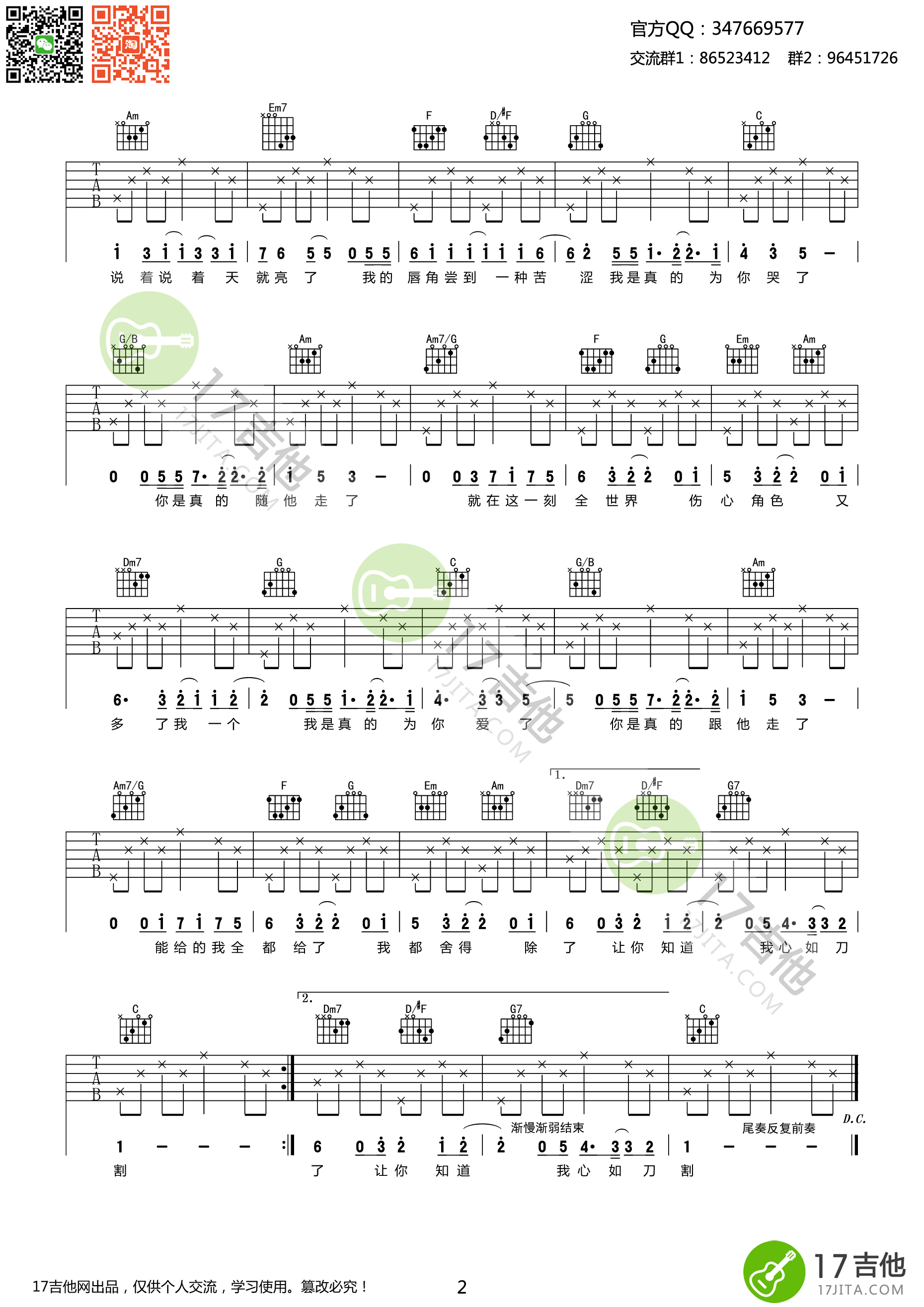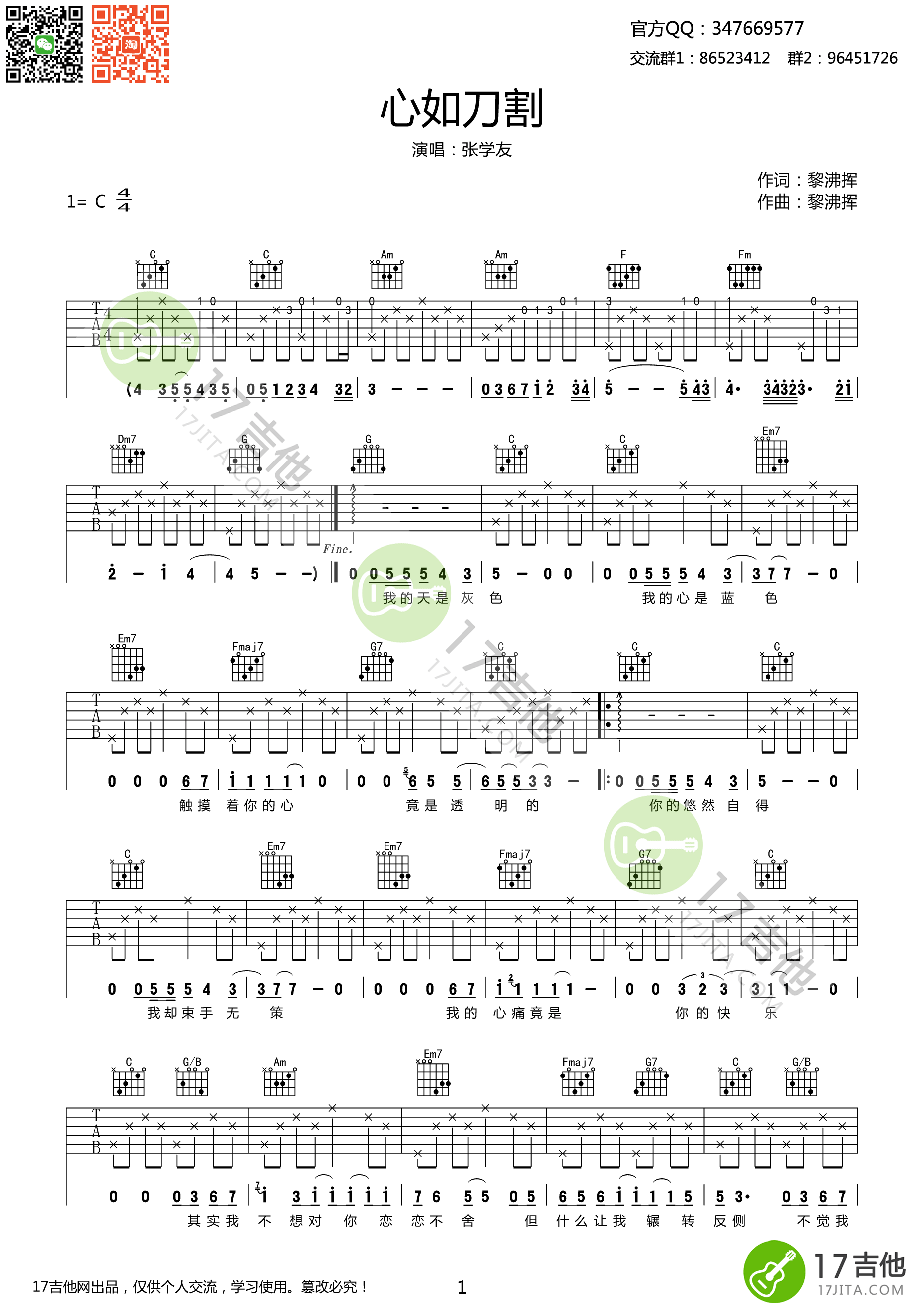 曲谱介绍: 张学友《心如刀割》吉他弹唱谱,采用C调指法编配,17吉他编配出品,共有2张高清图谱,免翻页排版设计。