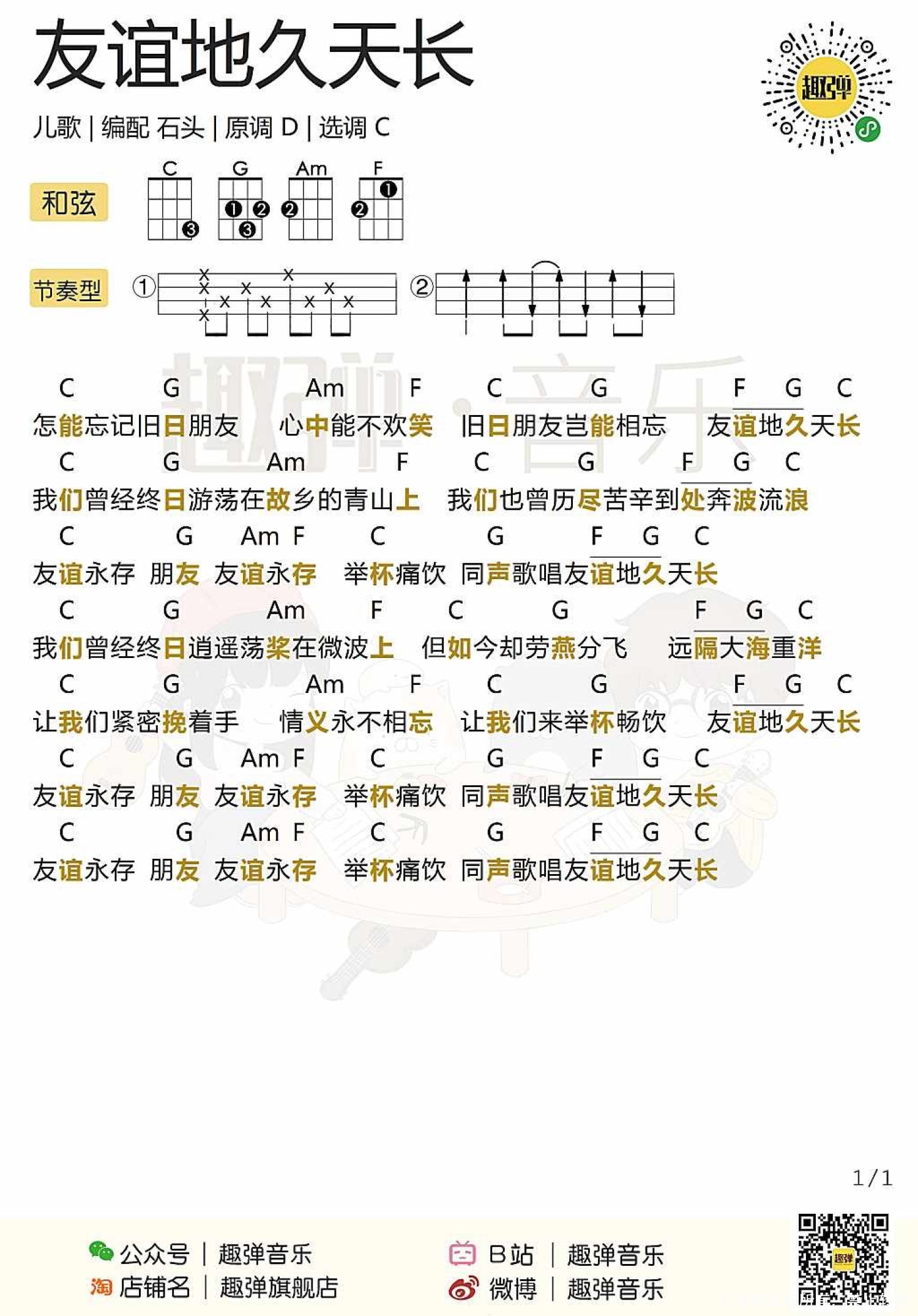 曲谱介绍: 儿歌《友谊地久天长》尤克里里谱,共有1张高清图谱,免翻页排版设计。