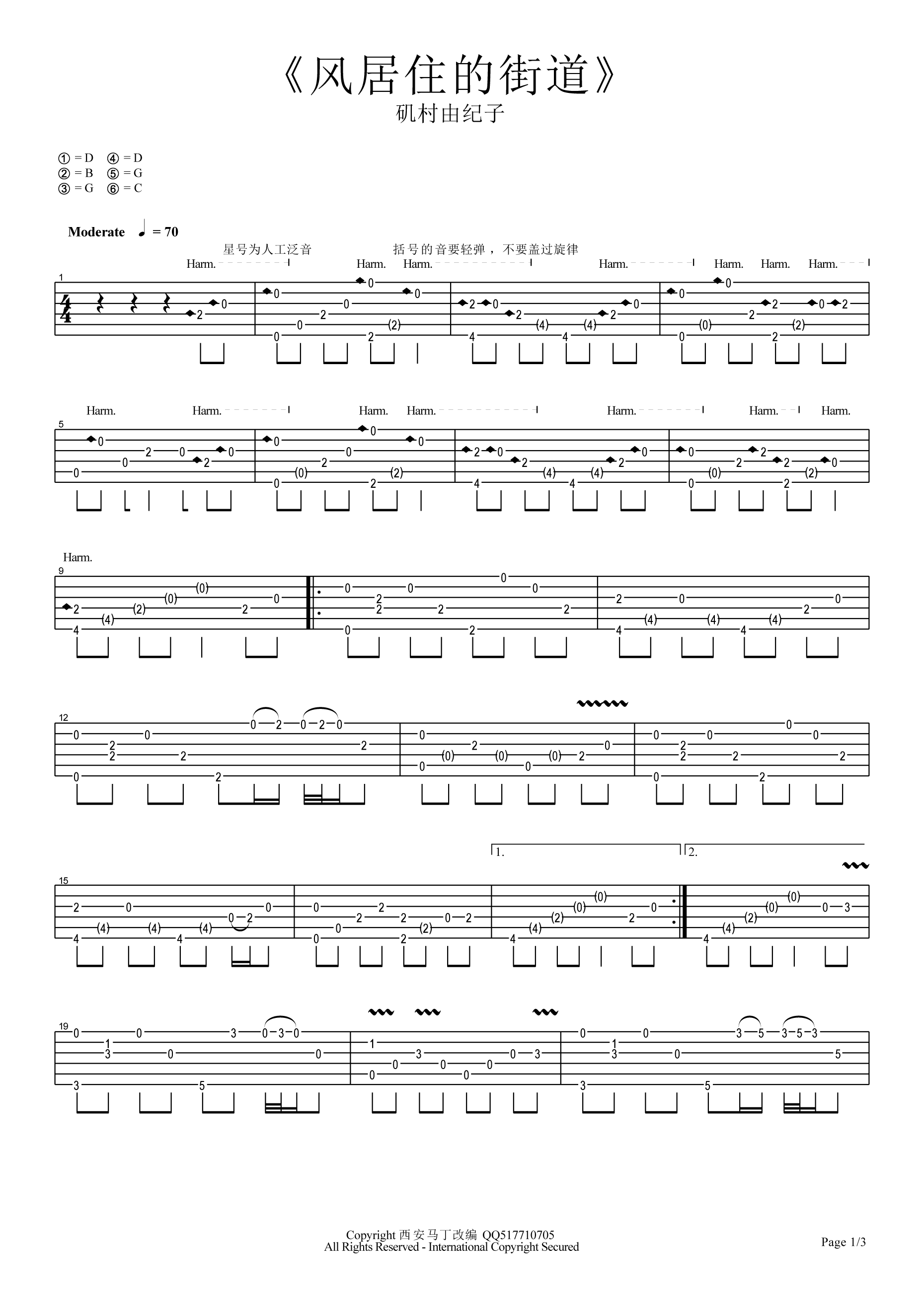 曲谱介绍: 矶村由纪子《风居住的街道》吉他独奏谱,采用D调指法编配,共有3张高清图谱。