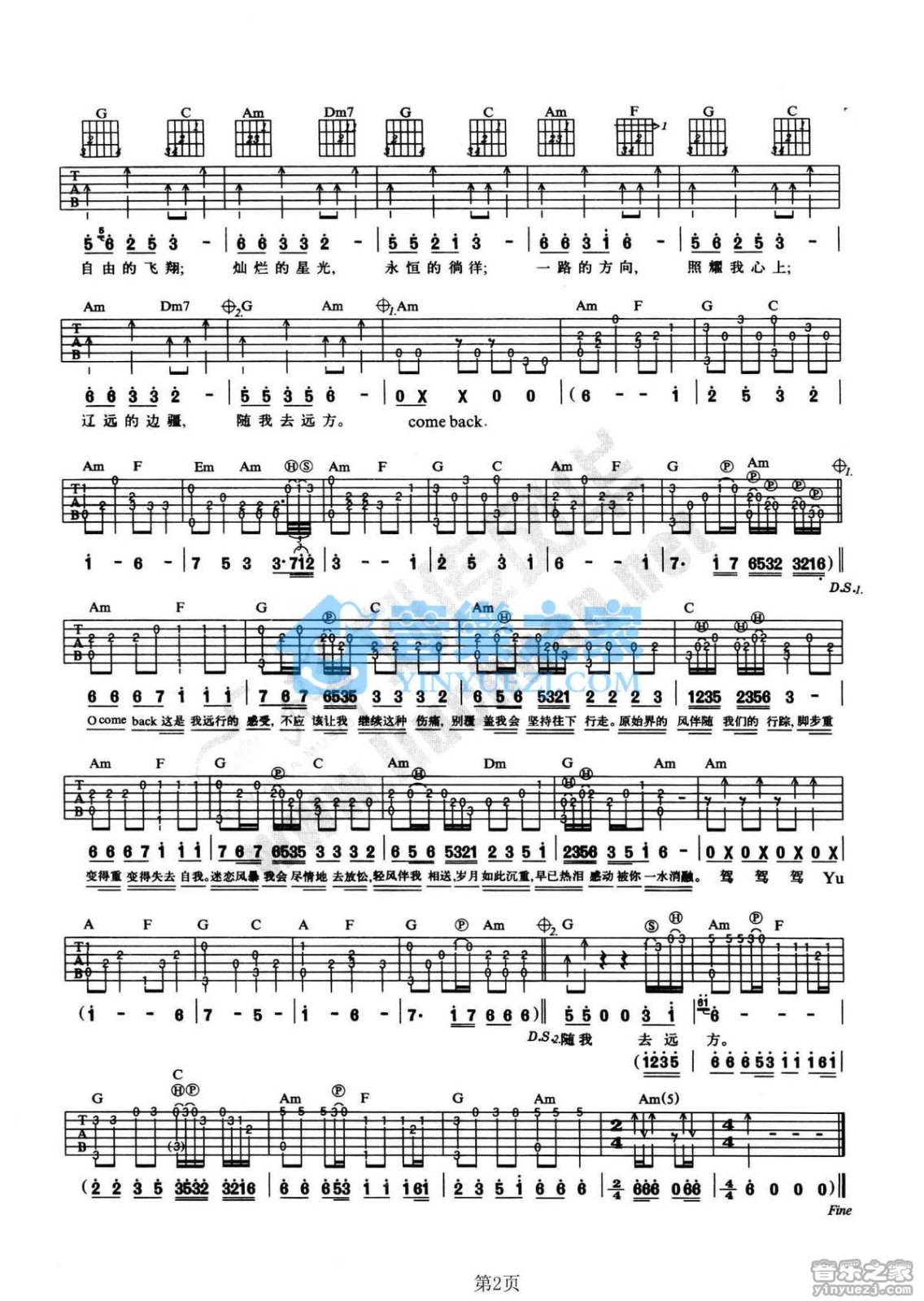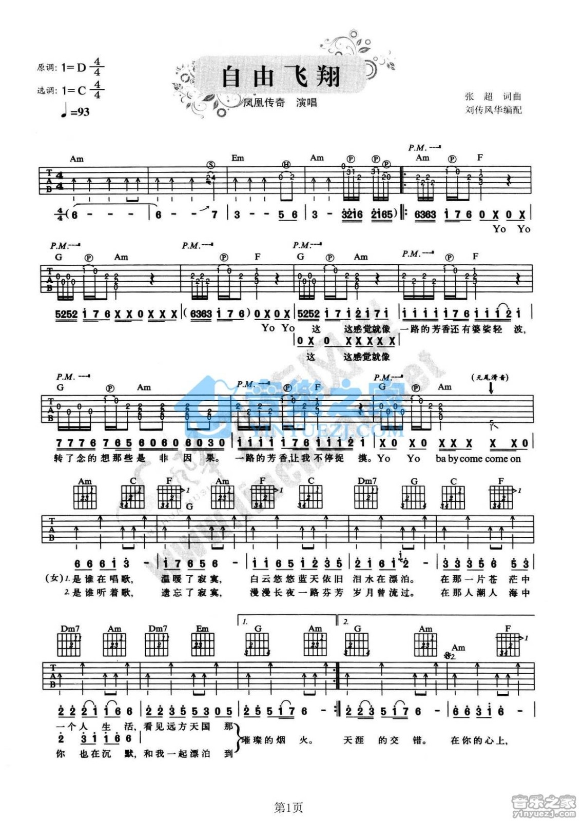 曲谱介绍: 凤凰传奇《自由飞翔》吉他弹唱谱,采用C调指法编配,音乐之家编配出品,共有2张高清图谱,免翻页排版设计。