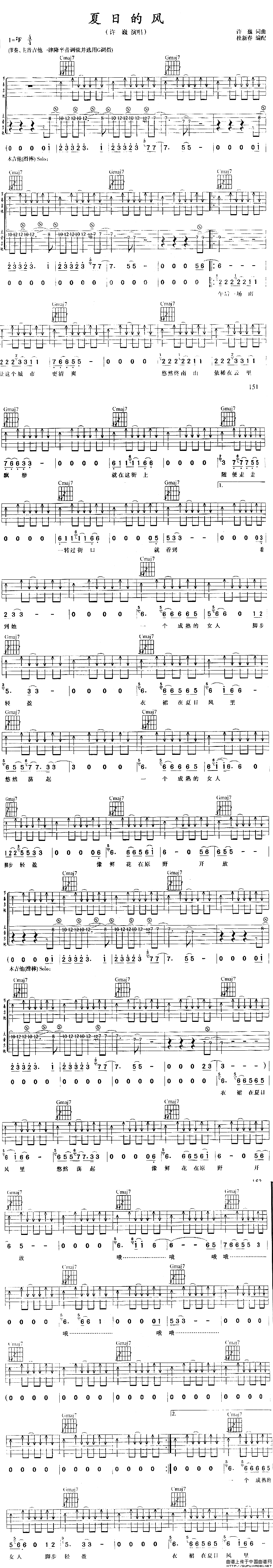 曲谱介绍: 许巍《夏日的风》吉他弹唱谱,采用F调指法编配,杜新春编配出品,共有1张高清图谱,免翻页排版设计。