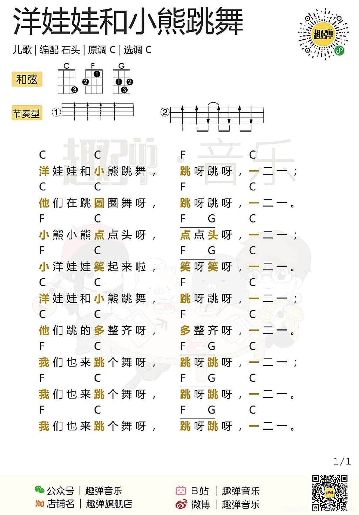 曲谱介绍: 儿歌《洋娃娃和小熊跳舞》尤克里里谱,共有1张高清图谱,免翻页排版设计。
