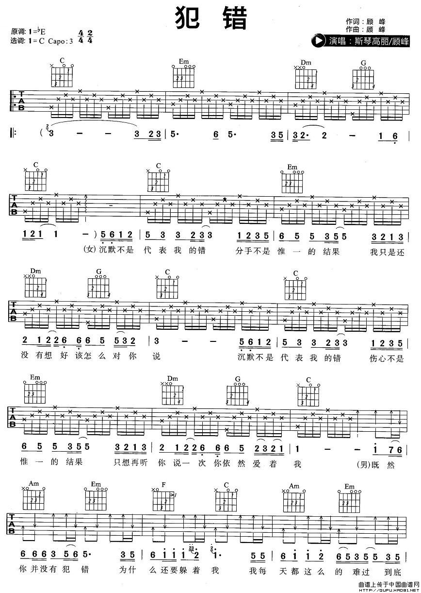 曲谱介绍: 斯琴高丽《犯错》吉他弹唱谱,采用C调指法编配,中国曲谱网编配出品,共有2张高清图谱,免翻页排版设计。