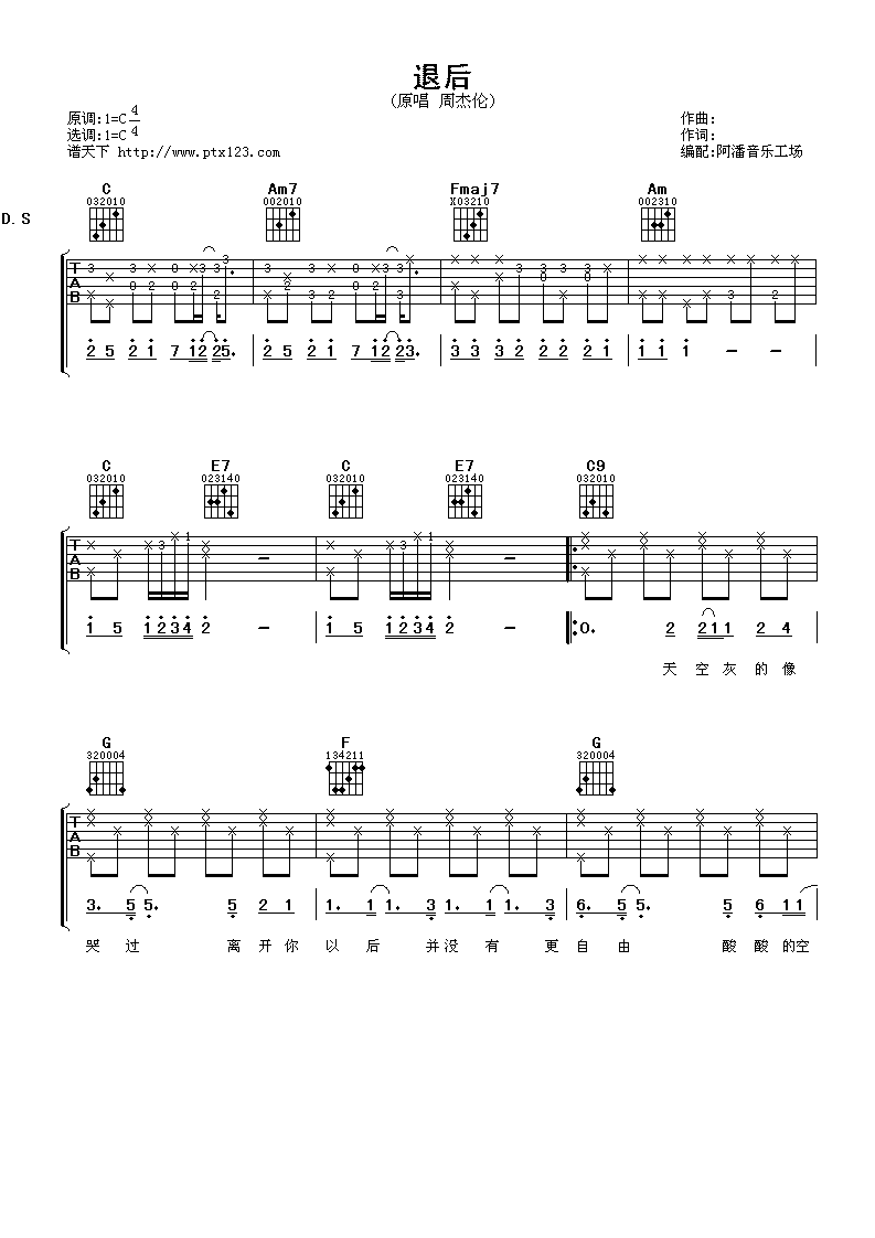 曲谱介绍: 周杰伦《退后》吉他弹唱谱,采用C调指法编配,阿潘音乐工场编配出品,共有3张高清图谱。