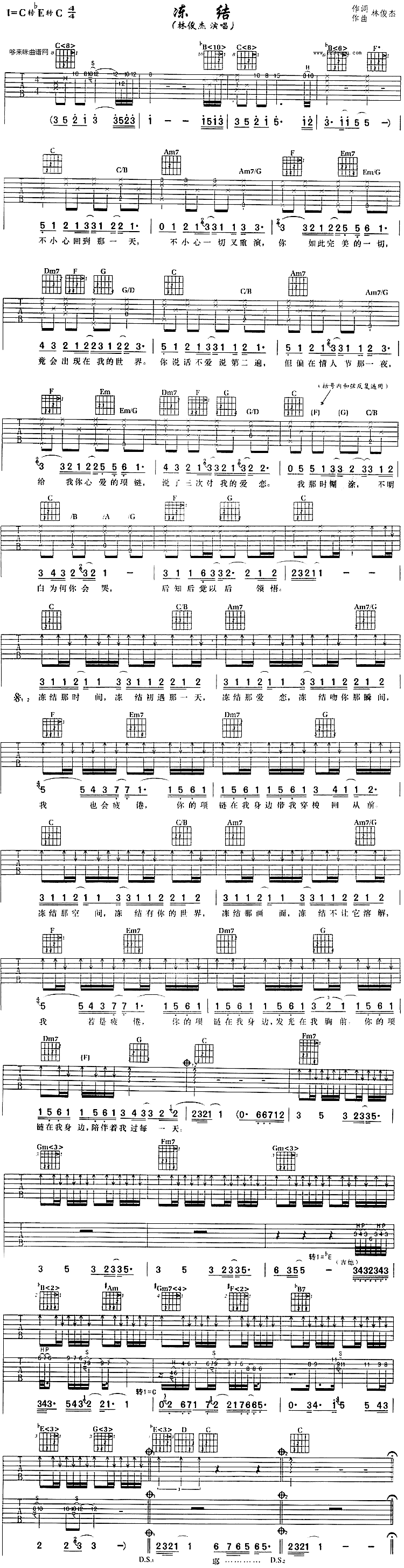 曲谱介绍: 林俊杰《冻结》吉他弹唱谱,采用C调指法编配,共有1张高清图谱,免翻页排版设计。