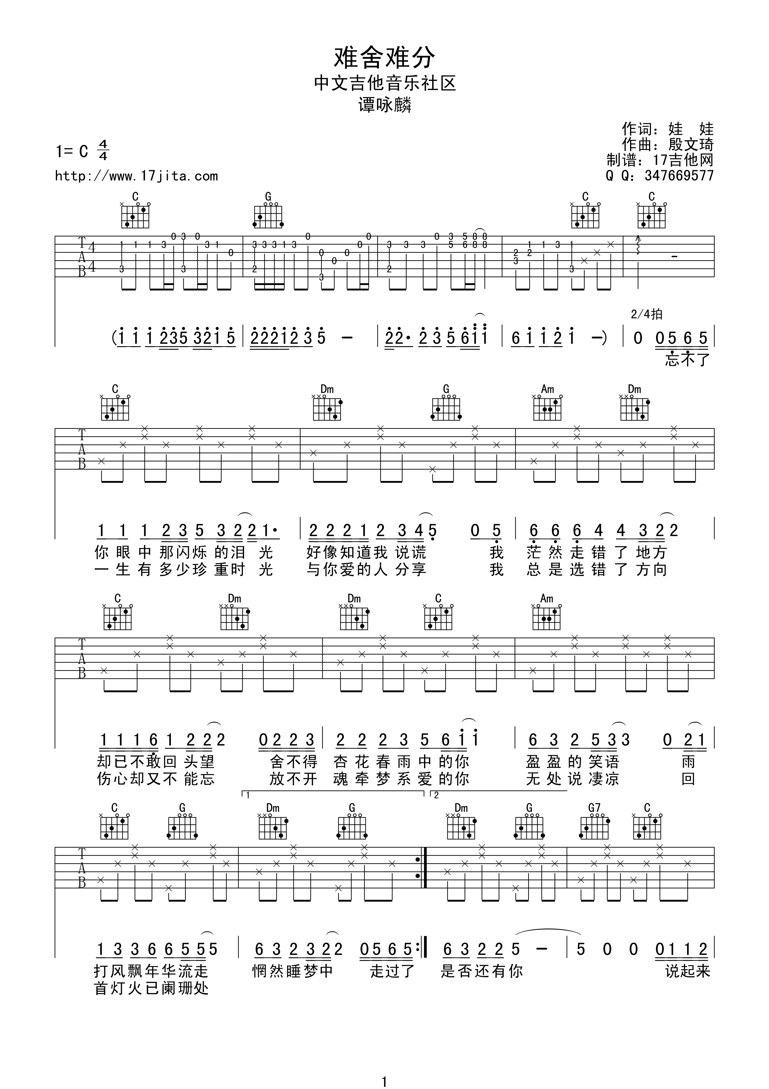 曲谱介绍: 谭咏麟《难舍难分》吉他弹唱谱,采用C调指法编配,17吉他编配出品,共有2张高清图谱,免翻页排版设计。