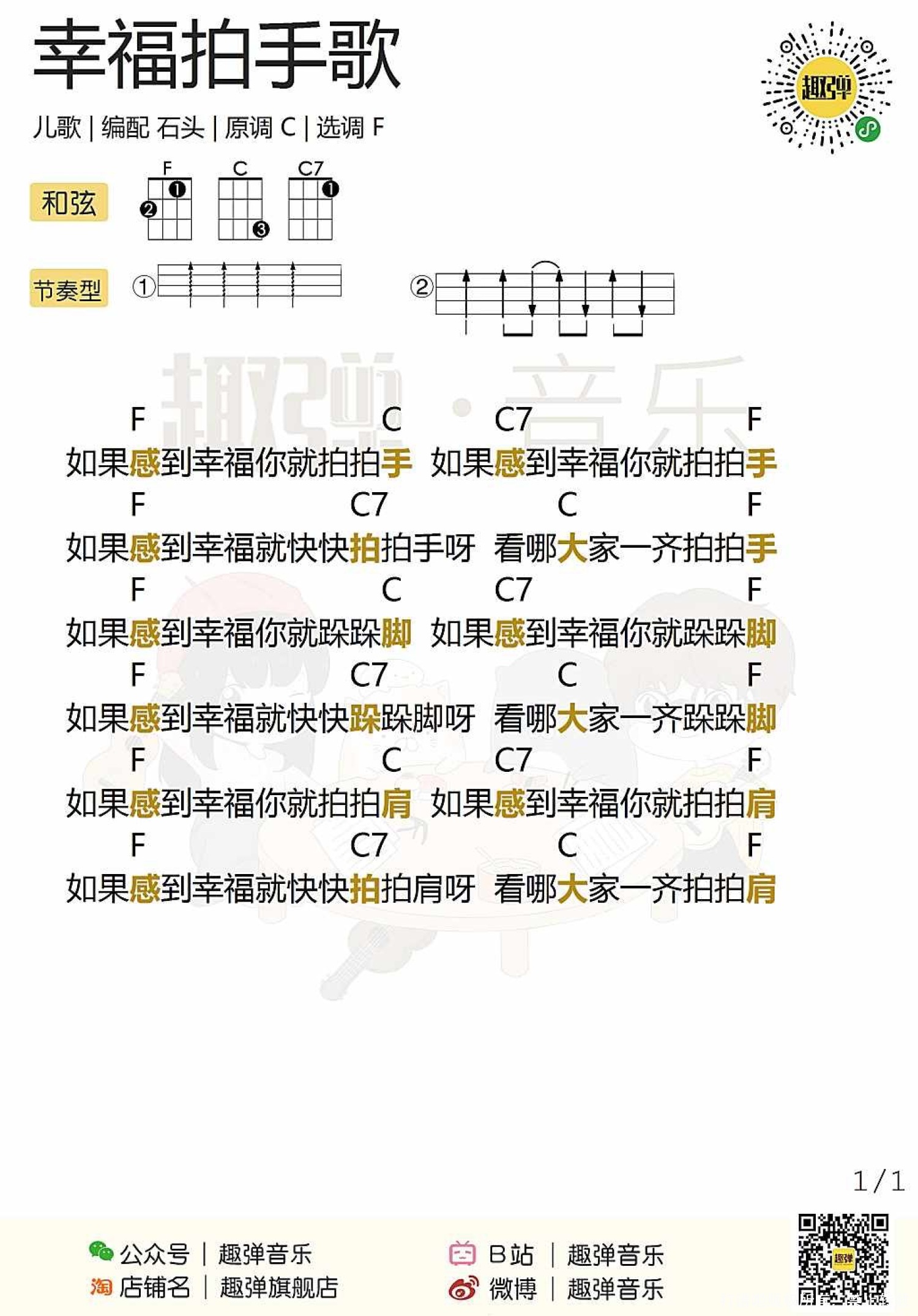 曲谱介绍: 儿歌《幸福拍手歌》尤克里里谱,共有1张高清图谱,免翻页排版设计。