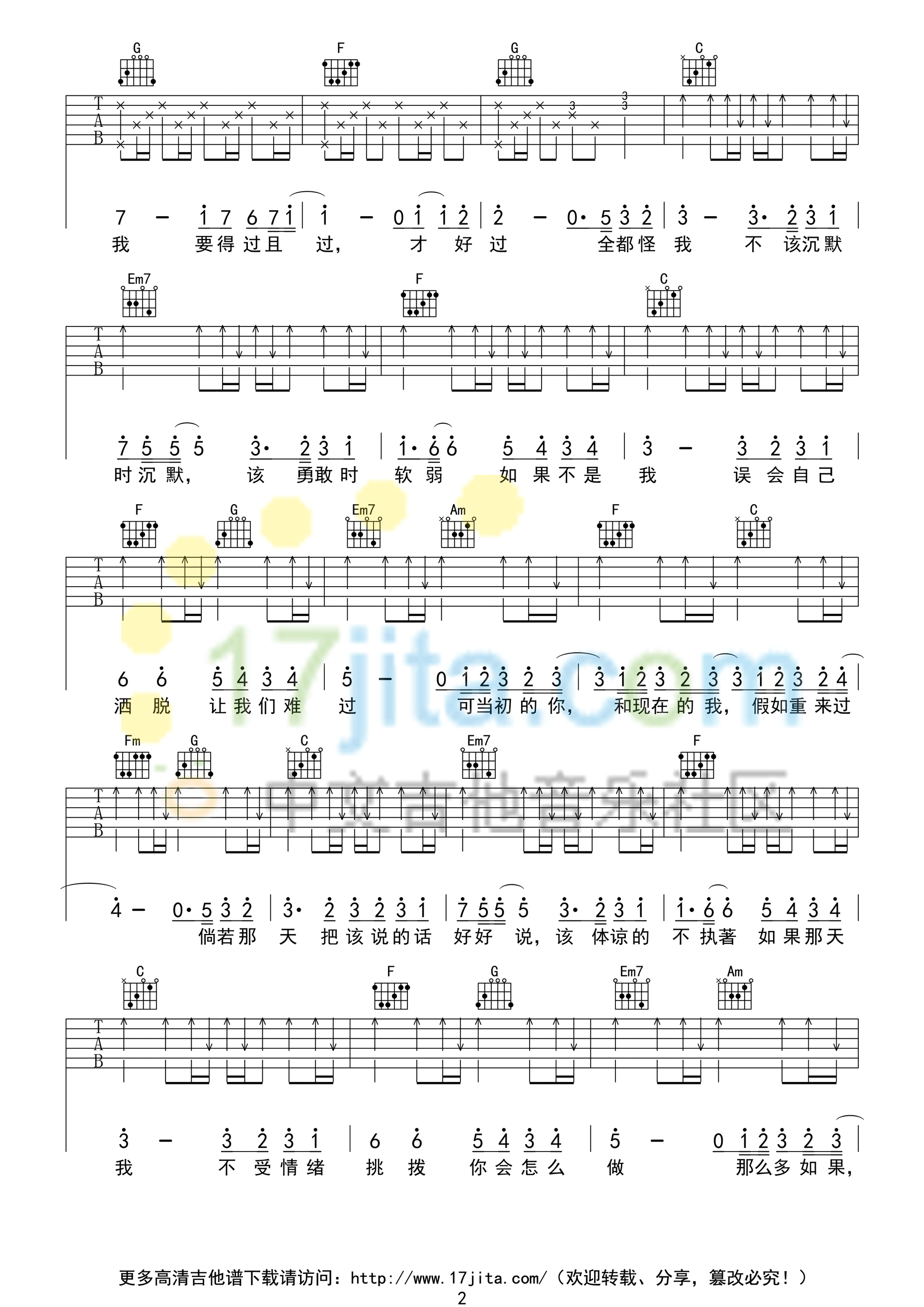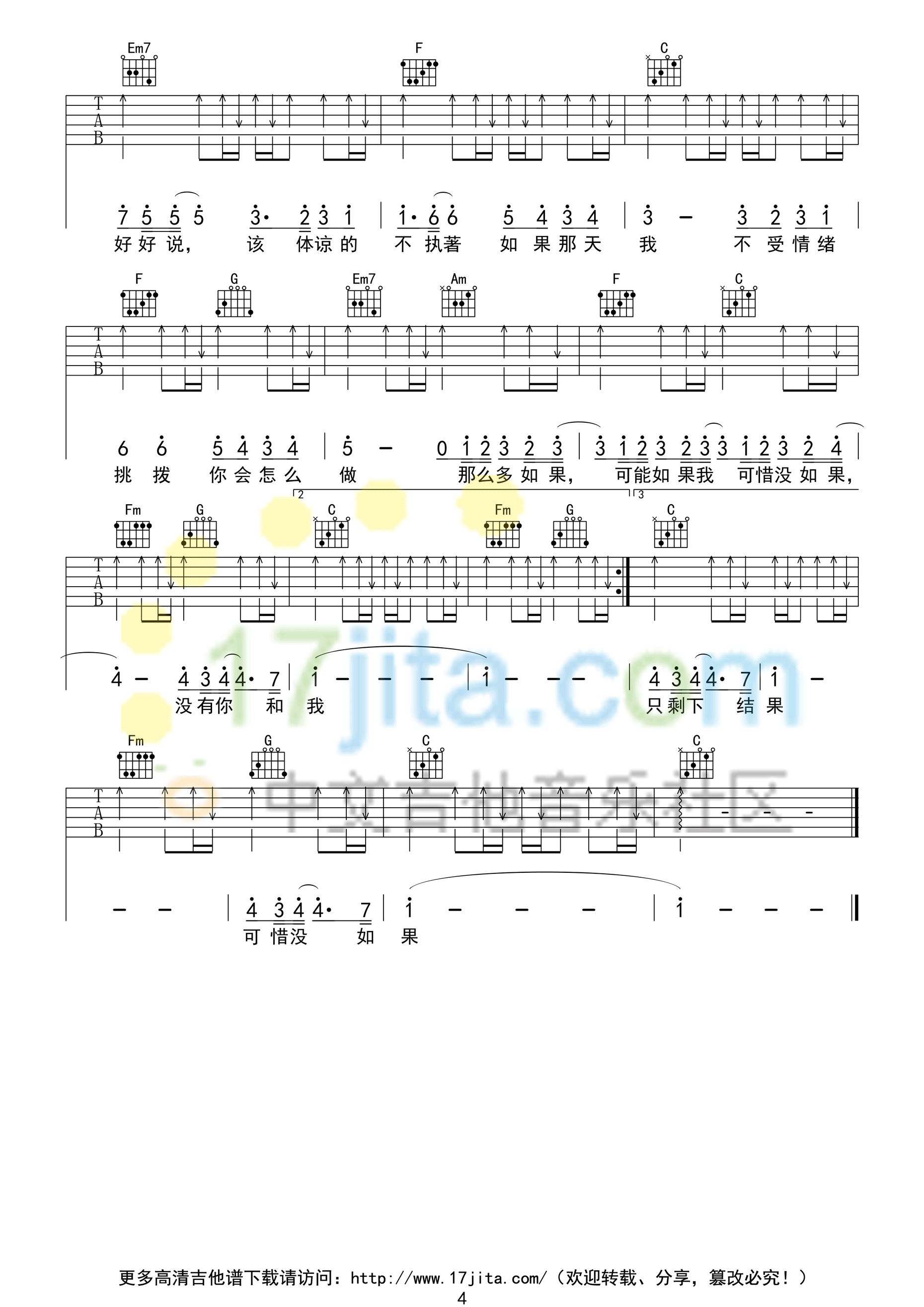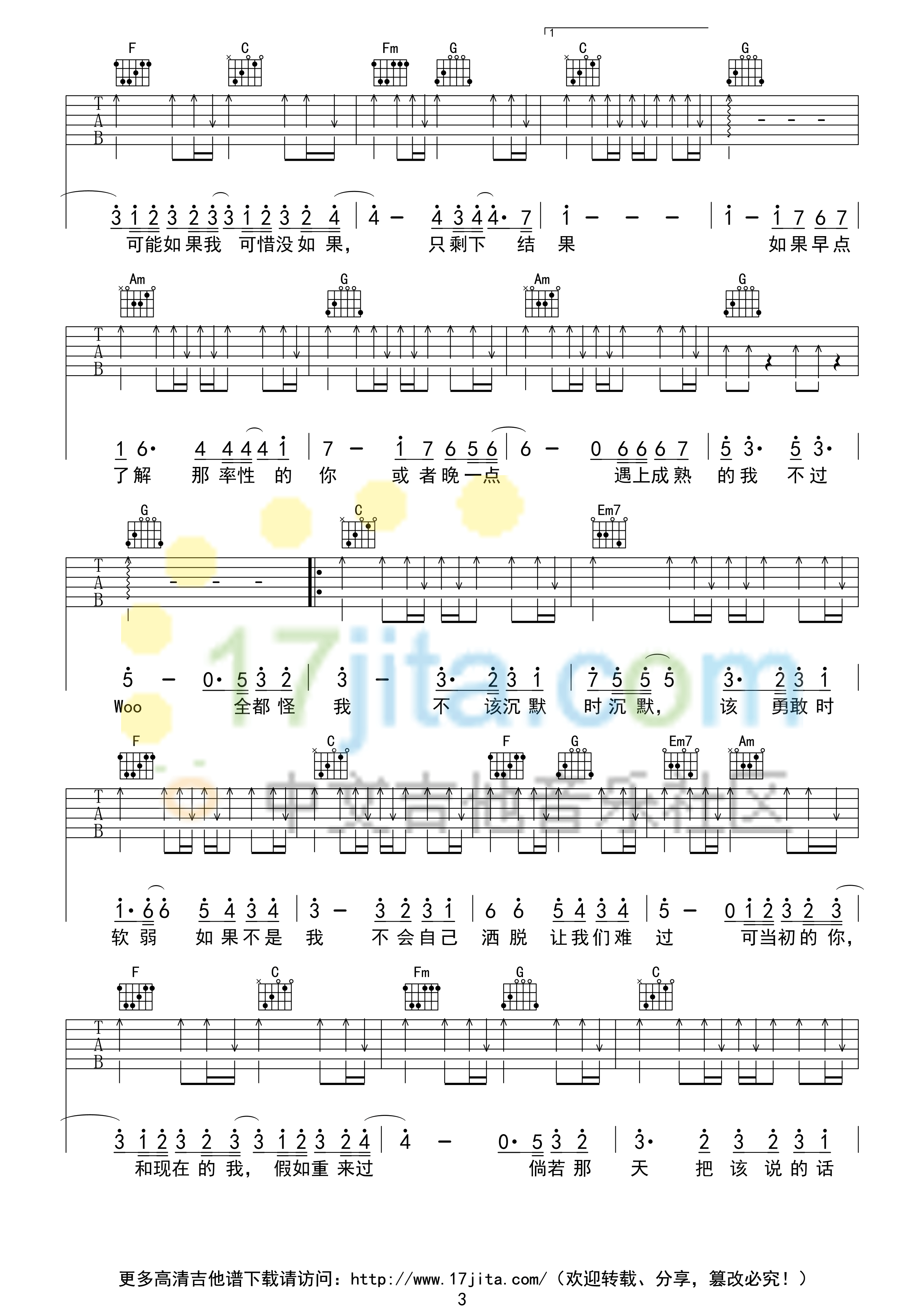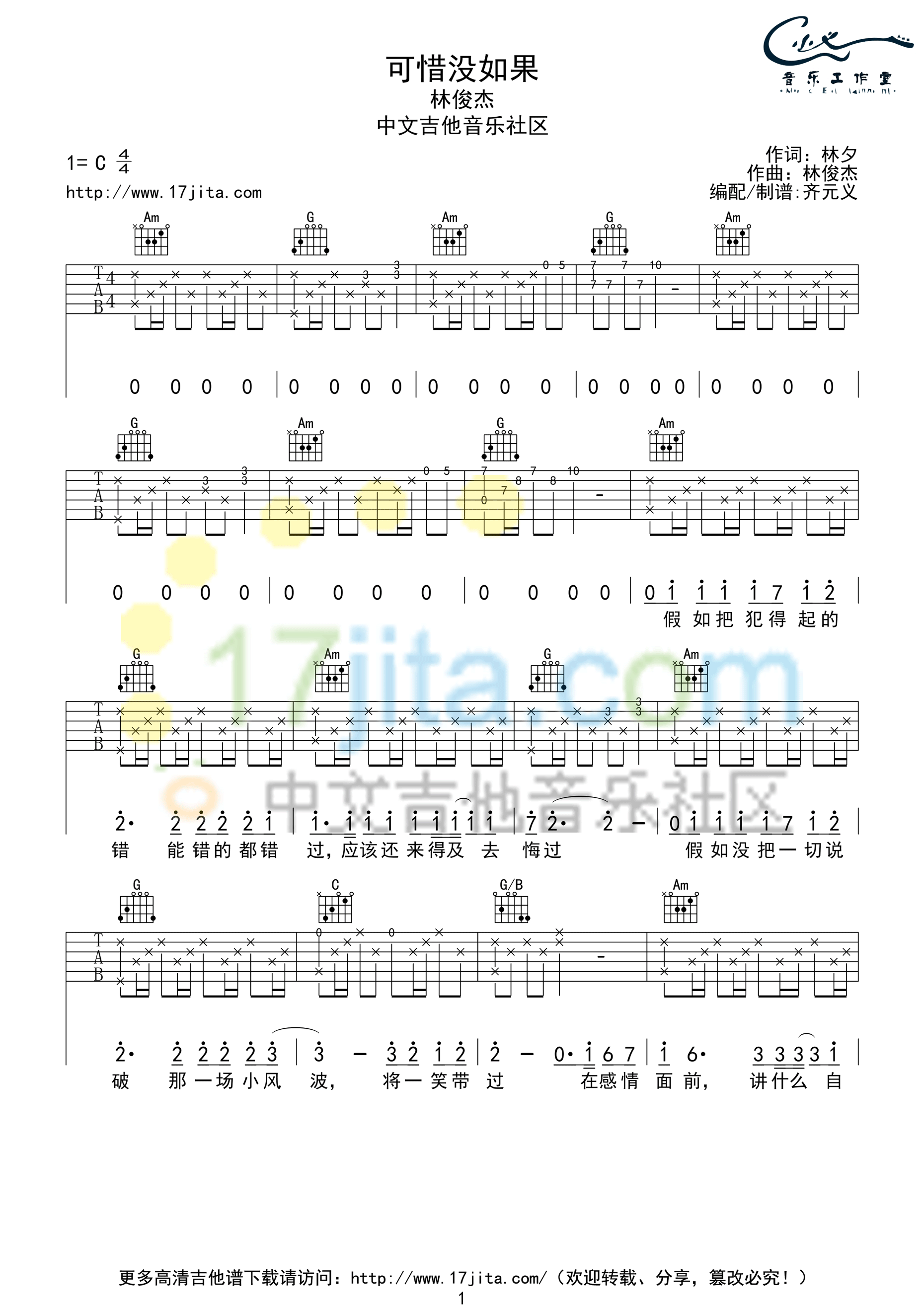 曲谱介绍: 林俊杰《可惜没如果》吉他弹唱谱,采用C调指法编配,17吉他编配出品,共有4张高清图谱。