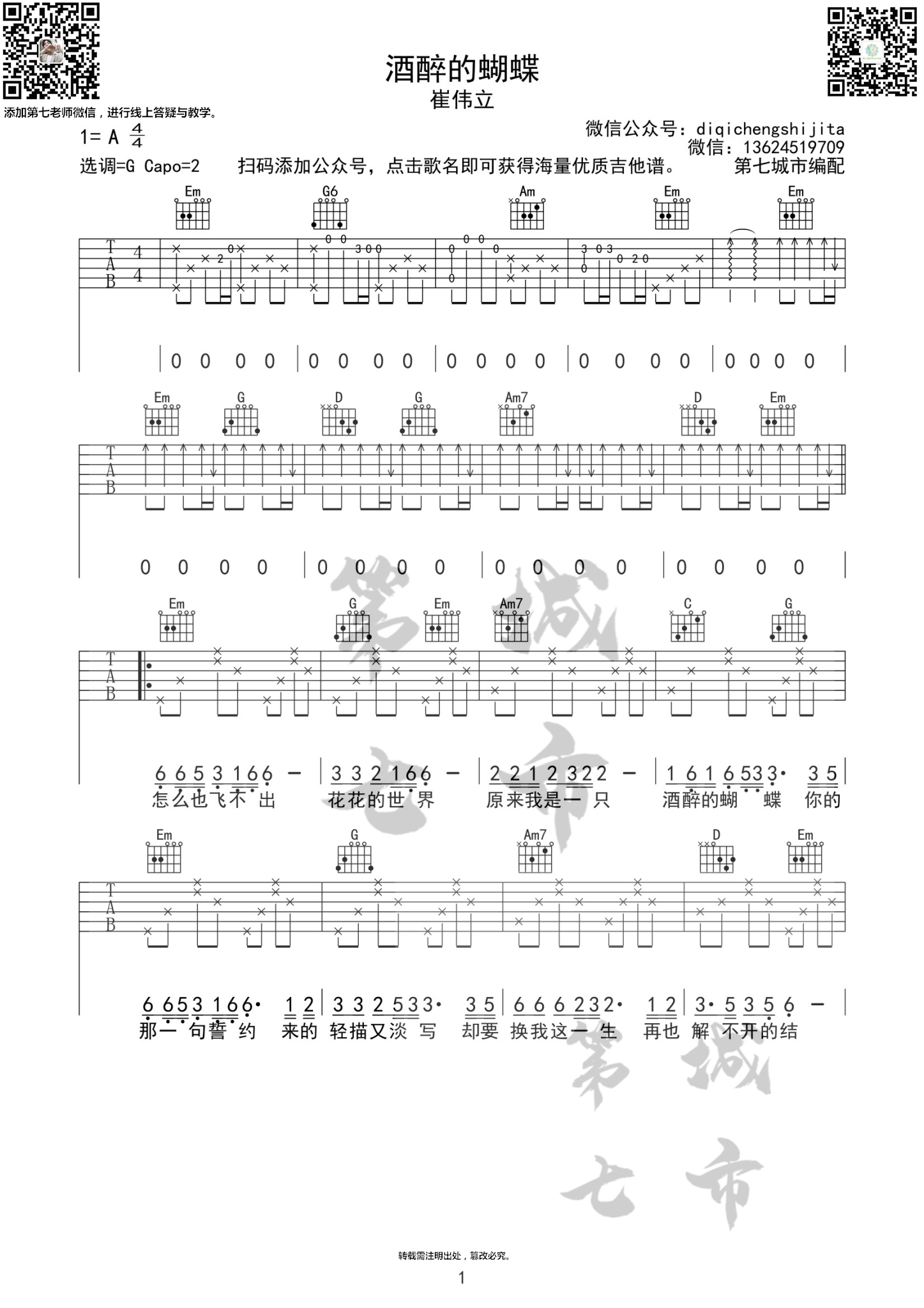曲谱介绍: 崔伟立《酒醉的蝴蝶》吉他弹唱谱,采用A调指法编配,第七城市编配出品,共有2张高清图谱,免翻页排版设计。
