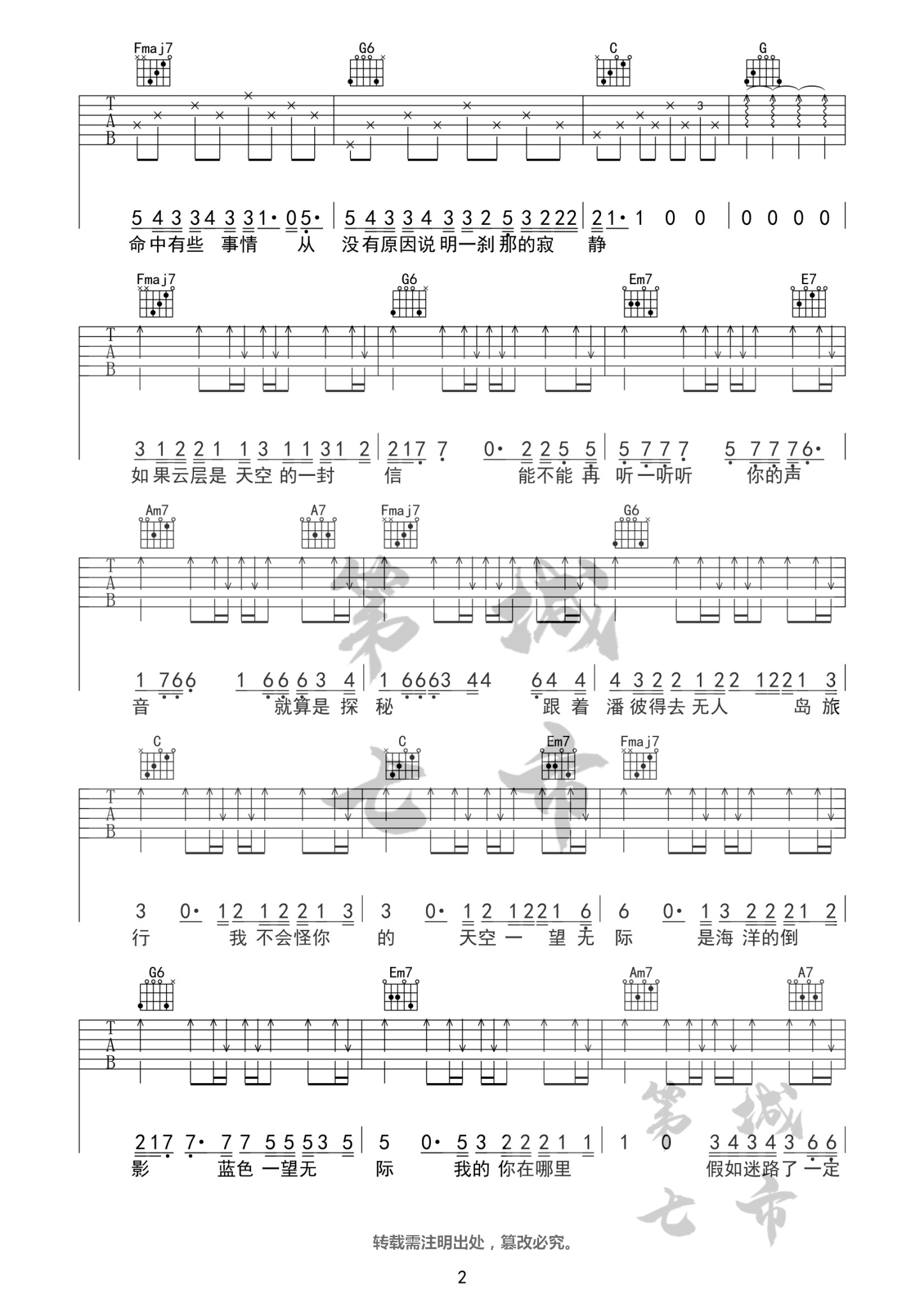 曲谱介绍: 无人之岛吉他谱采用了C调指法,由第七城市编配完成。这首歌曲的曲谱适合初学者弹奏,选用C调指法,变调夹5品弹奏。