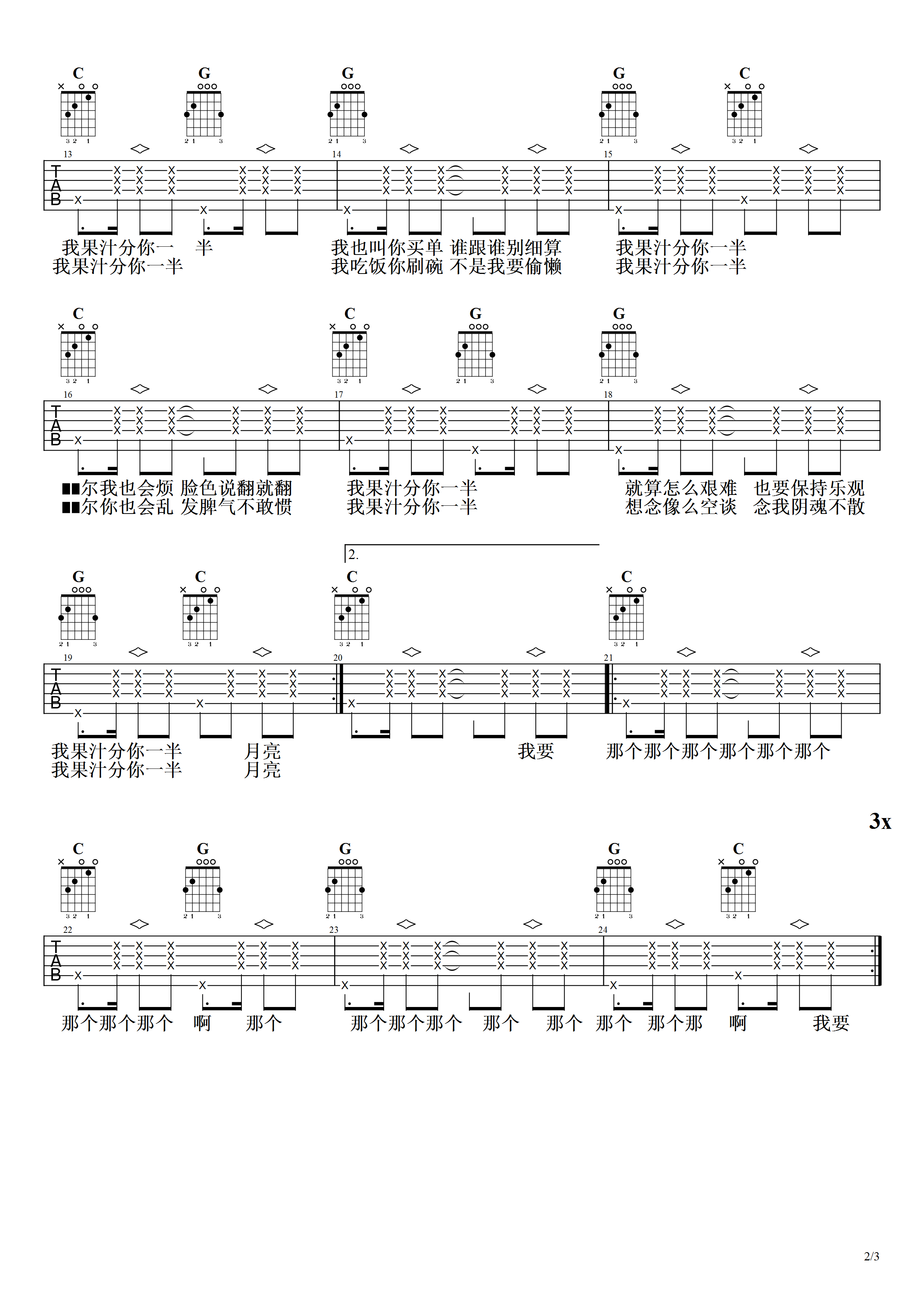 曲谱介绍: 我的果汁分你一半吉他谱采用了C调指法,由第七城市编配完成。这首歌曲的曲谱适合初学者弹奏,选用C调指法,变调夹1品弹奏。