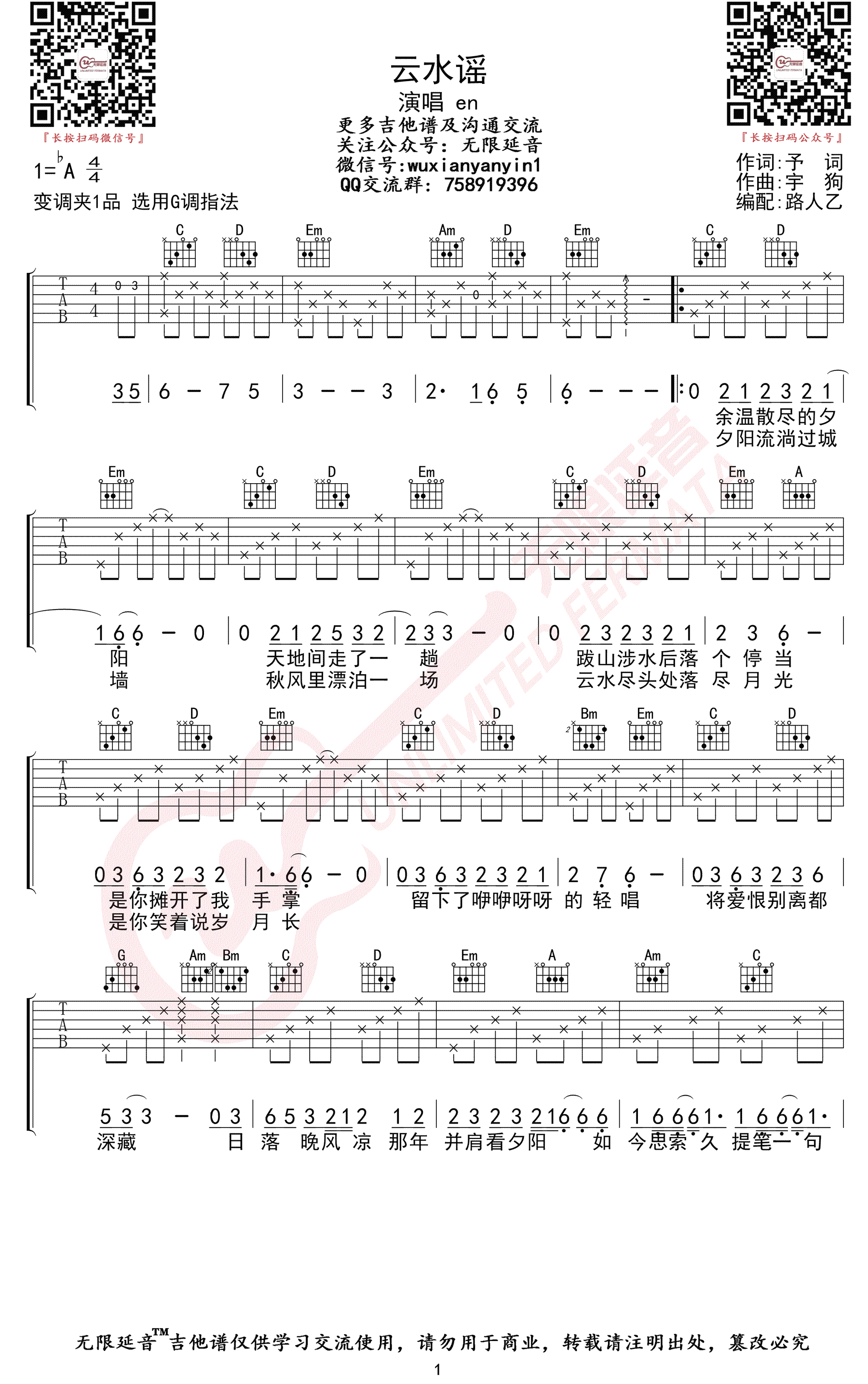 曲谱介绍: EN《云水谣》吉他弹唱谱,采用A调指法编配,无限延音编配出品,共有2张高清图谱,免翻页排版设计。